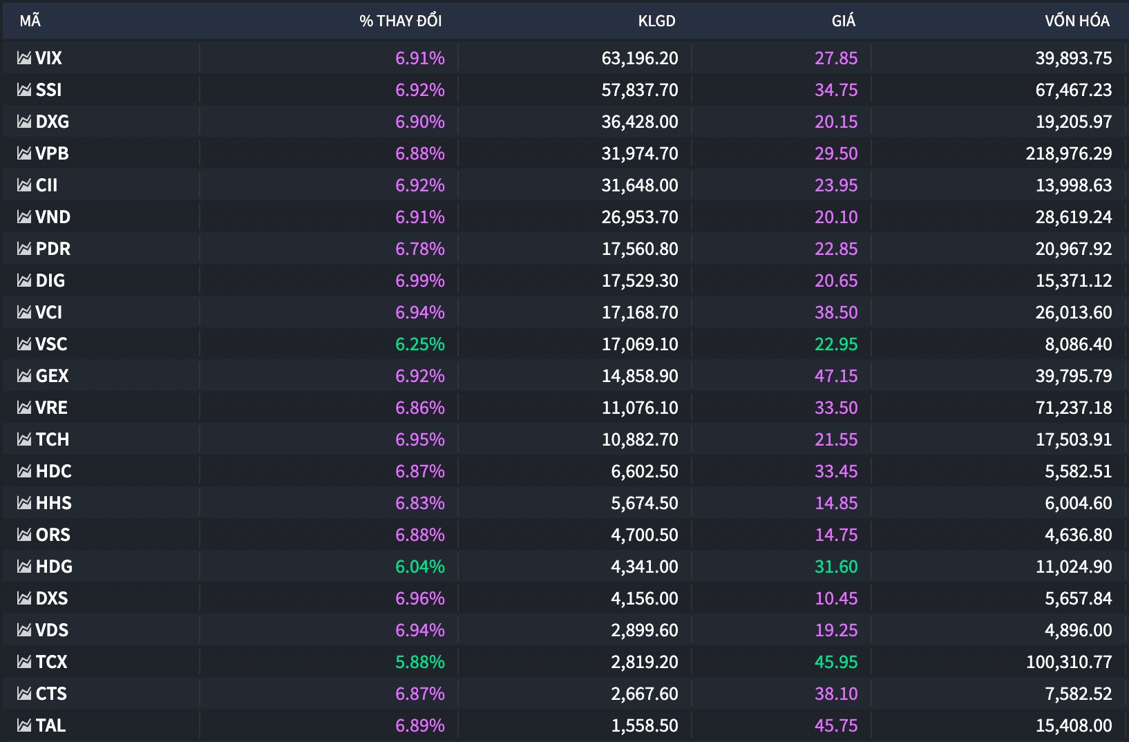 VIX cũng đảo chiều tăng một mạch lên kịch trần sau chuỗi ngày giảm liên tục hơn 30% giai đoạn vừa qua, tăng 6,91% lên 27.850 đồng/cổ phiếu. Cùng với VIX và SSI, VND và VCI cũng tím lịm.