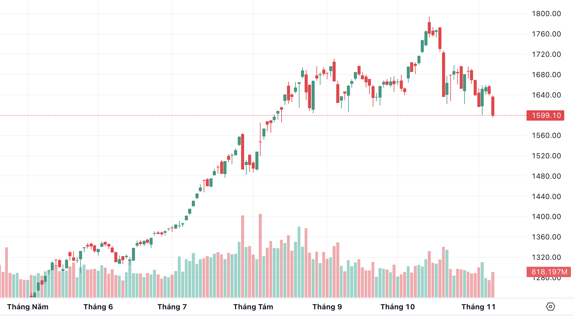Chứng khoán Việt Nam kết thúc tuần giao dịch 3/11 - 7/11 bằng một phiên giảm điểm mạnh. Đóng cửa phiên 7/11, VN-Index giảm 43,54 điểm về 1.599,1 điểm, tương ứng -2,65%.