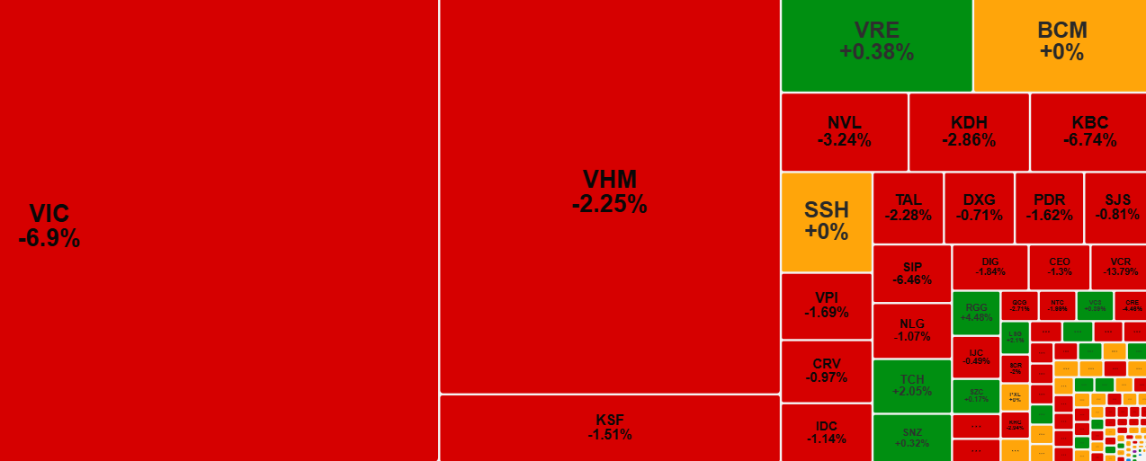 Tuy nhiên, tác động mạnh nhất đến đà giảm của thị trường là nhóm bất động sản, khi VIC lấy đi nhiều điểm nhất với 15,82 điểm; VHM lấy đi 2,03 điểm.