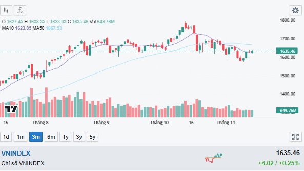 VN-Index vận động trong biên độ hẹp tại phiên 14/11 với mức tăng 4,02 điểm - tương đương 0,25% và chỉ số chung dừng ở mức 1.635,46 điểm.