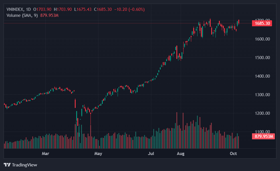 Kết phiên, VN-Index giảm 10,2 điểm (-0,6%) xuống 1.685,3 điểm; HNX-Index giảm 1,82 điểm (-0,7%) còn 272,87 điểm, trong khi UPCoM-Index ngược dòng tăng 1,08 điểm (+1%) lên 110,24 điểm.