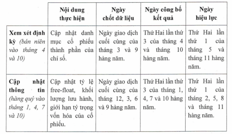 Lịch xem xét định kỳ và cập nhật thông tin với chỉ số VNDIVIDEND.