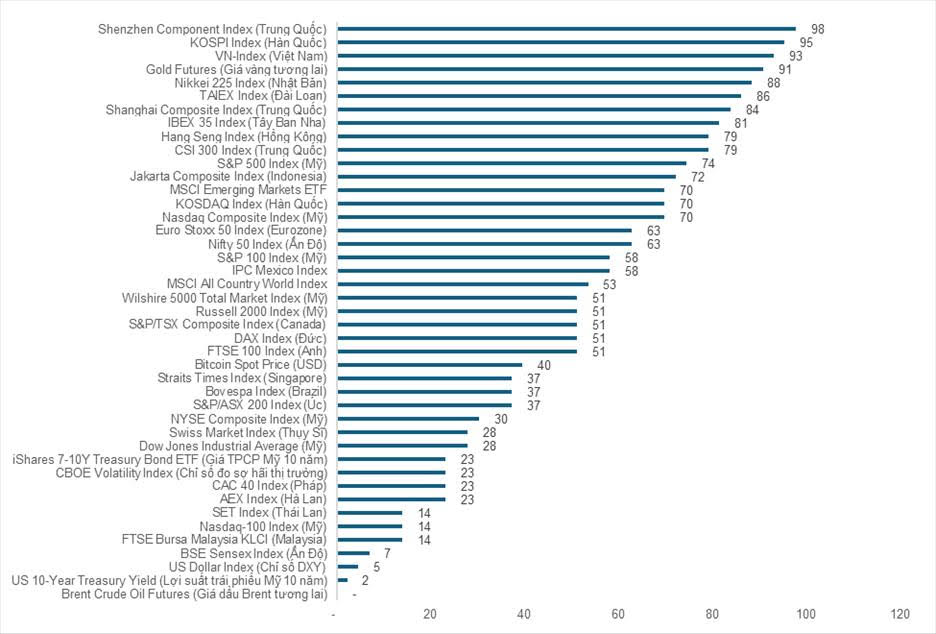 Ông Nguyễn Thế Minh, Giám đốc phân tích khối khách hàng cá nhân, Công ty Chứng khoán Yuanta Việt Nam cho biết, thị trường chứng khoán Việt Nam quay trở lại top tăng trưởng cao, trong khi Trung Quốc và Hàn Quốc vẫn duy trì ở mức tăng trưởng mạnh nhất so với các thị trường khác. Tuy nhiên, mức tăng trưởng của chỉ số VIX (thường được gọi là chỉ số sợ hãi hoặc là thước đo của sự sợ hãi) ở mức 23 điểm, cho thấy nhà đầu tư đang thận trọng hơn với phản ứng thuế quan của Tổng thống Mỹ đối với Trung Quốc trong phiên 10/10/2025.