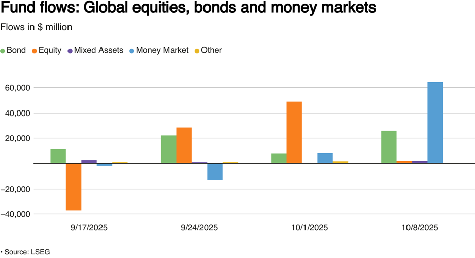 Dòng vốn đổ vào quỹ đầu tư cổ phiếu toàn cầu đã giảm xuống mức thấp nhất trong ba tuần trong tuần tính đến ngày 08/10, khi các nhà đầu tư tạm nghỉ sau đợt tăng giá gần đây của thị trường trong bối cảnh rủi ro liên quan đến sự sụp đổ của chính phủ Pháp và tình trạng đóng cửa chính phủ đang diễn ra tại Mỹ.