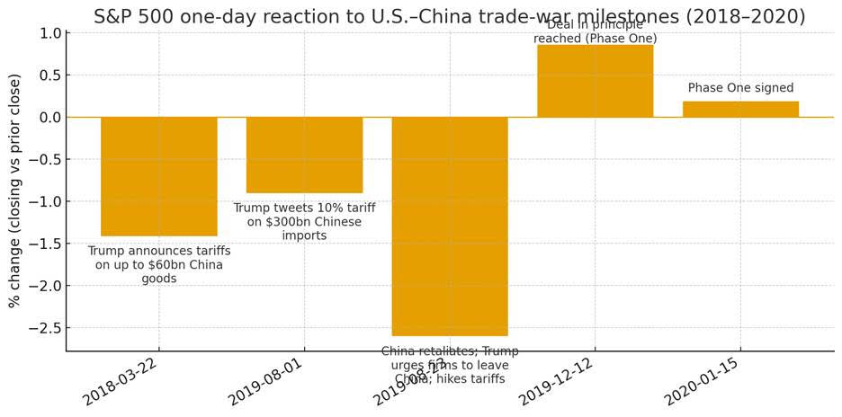 Căng thẳng thương mại giữa Mỹ và Trung Quốc đang ở giai đoạn tương tự cuối tháng 08/2019. Trung Quốc trả đũa gây ra cú shock giảm lên chỉ số S&P500 và các lần sau đó cả hai bên đạt được thỏa thuận nên đã tác động tích cực lên thị trường chứng khoán.