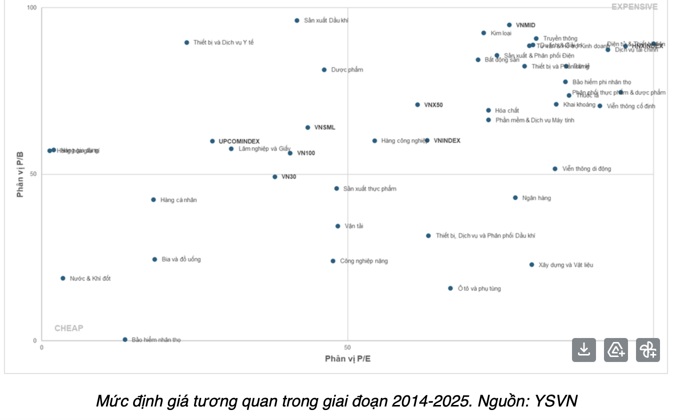 Về thị trường chứng khoán Việt Nam, Công ty Chứng khoán Yuanta Việt Nam nhận định, tính đến thời điểm hiện tại, nhóm cổ phiếu VN30, VN100 vẫn là các nhóm cổ phiếu có mức định giá thấp mặc dù các chỉ số này đã liên tục xác lập mức đỉnh kỷ lục trong thời gian qua, điều này cũng là lý do chính khiến dòng tiền vẫn chủ yếu tập trung ở nhóm vốn hóa lớn.