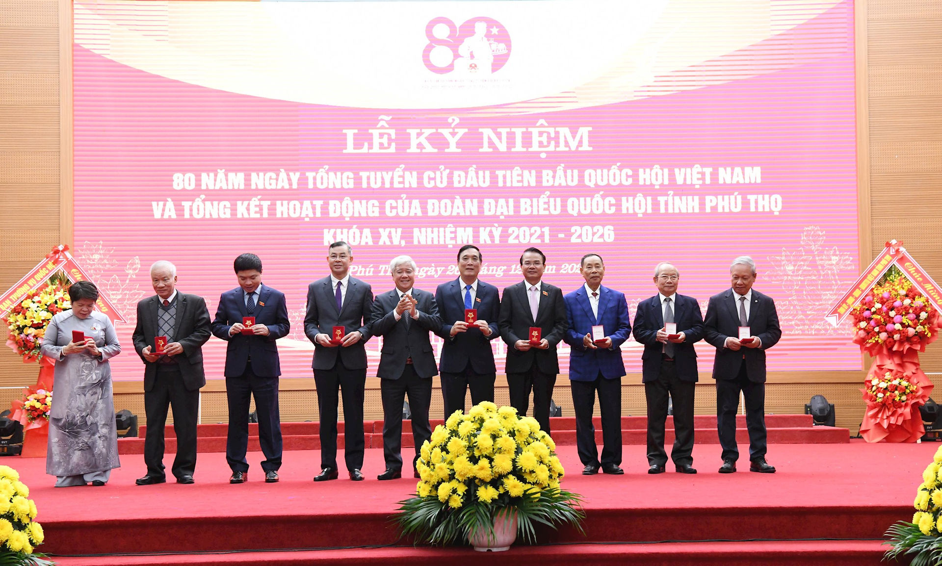 Phó Thủ tướng Chính phủ Bùi Thanh Sơn, Chủ nhiệm Ủy ban Khoa học, Công nghệ và Môi trường Nguyễn Thanh Hải, Tổng Kiểm toán Nhà nước Ngô Văn Tuấn, Trưởng đoàn ĐBQH tỉnh Phú Thọ Bùi Minh Châu, Bí thư Tỉnh ủy Phú Thọ Trương Quốc Huy trao Kỷ niệm chương “Vì sự nghiệp Quốc hội Việt Nam” tặng ĐBQH tỉnh Phú Thọ qua các thời kỳ.