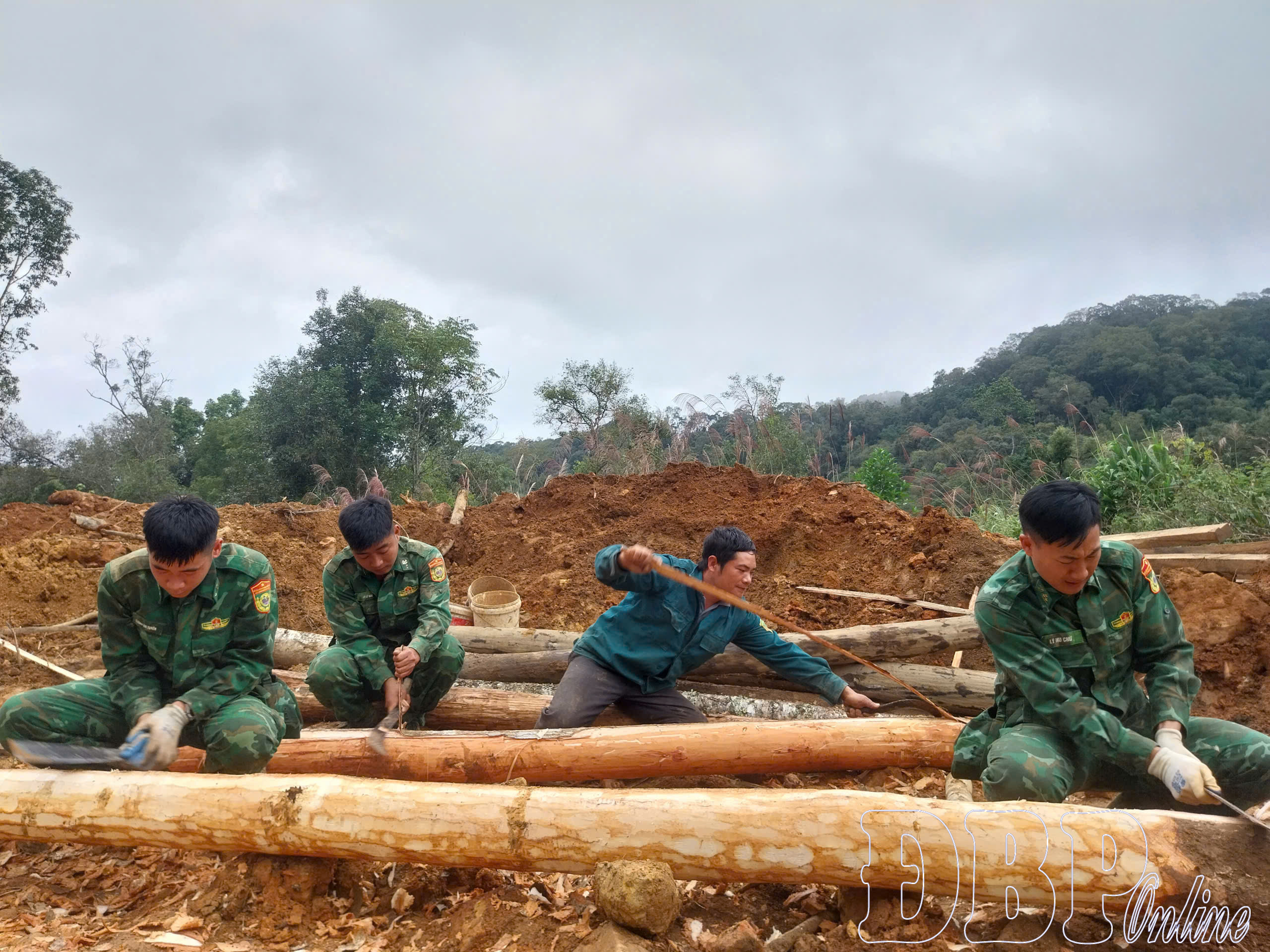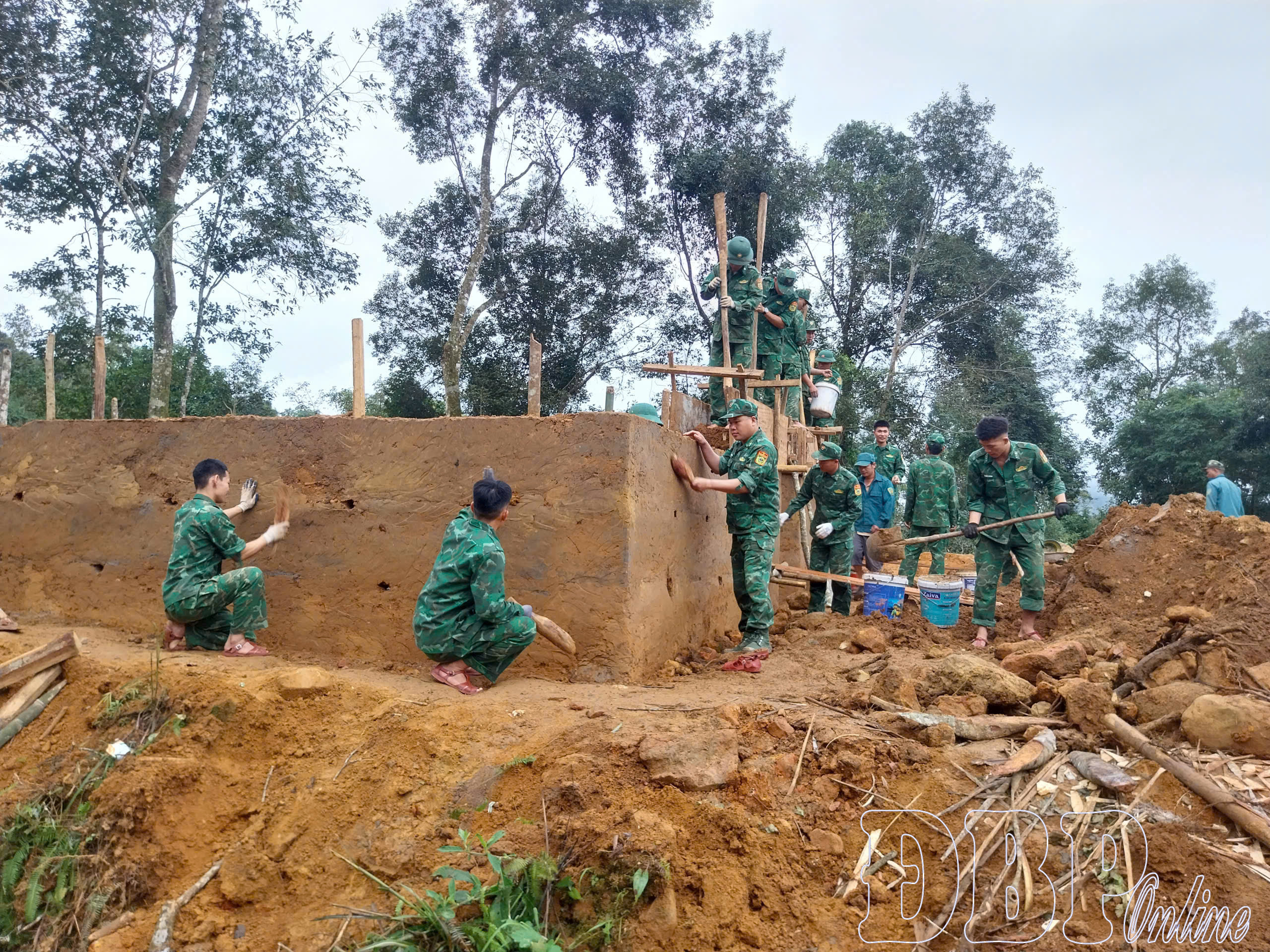 Cán bộ, chiến sĩ chuẩn bị nguyên, vật liệu giúp người dân dựng nhà. Ảnh: Hải yến