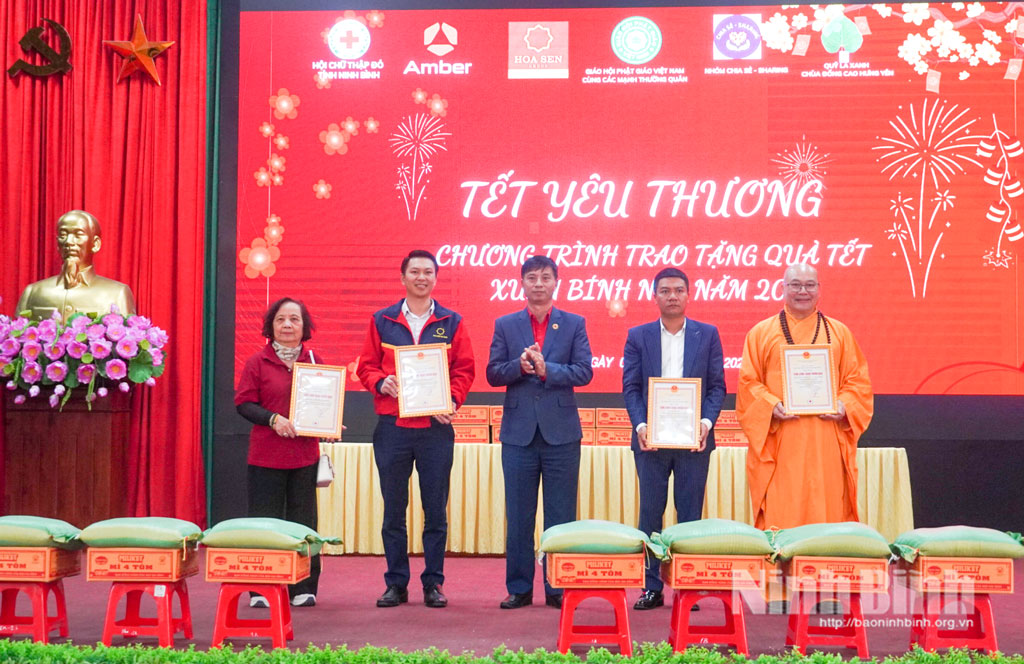 Lãnh đạo Hội Chữ thập đỏ tỉnh tặng Bằng ghi nhận Tấm lòng vàng nhân đạo cho đại diện Giáo hội Phật giáo Việt Nam và các nhà hảo tâm đã ủng hộ phong trào “Tết Nhân ái” Xuân Bính Ngọ năm 2026. Ảnh: Diệu Linh