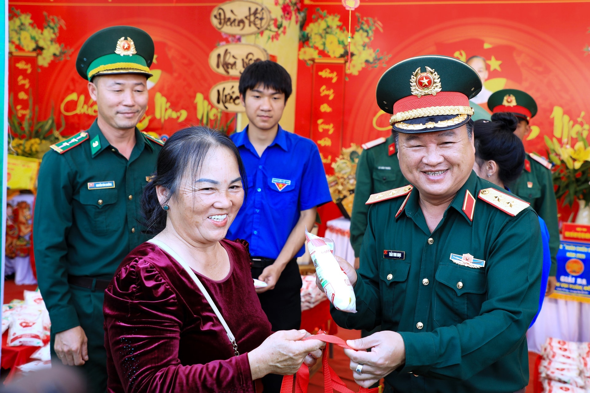 Niềm vui chung của Trung tướng Trần Vinh Ngọc và bà con vùng biên giới Lâm Đồng trước gian hàng 0 đồng trong chương trình “Xuân chiến sĩ 2026”. Ảnh: Lê Phước