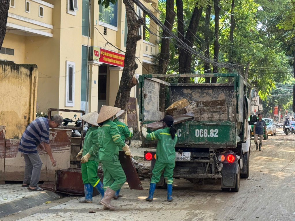 Ngay khi trời vừa hửng sáng, dòng nước đang rút dần, hàng trăm cán bộ, chiến sĩ, đoàn viên thanh niên và công nhân vệ sinh môi trường đã tỏa về các khu vực trung tâm để thu gom rác thải, xúc bùn, khơi thông cống rãnh. Trên các tuyến phố chính như: Kim Đồng, Hoàng Đình Giong - các điểm trước đó bị ngập sâu trong nước, nay được quét dọn sạch sẽ, dòng người và phương tiện dần trở lại nhịp sống thường ngày.