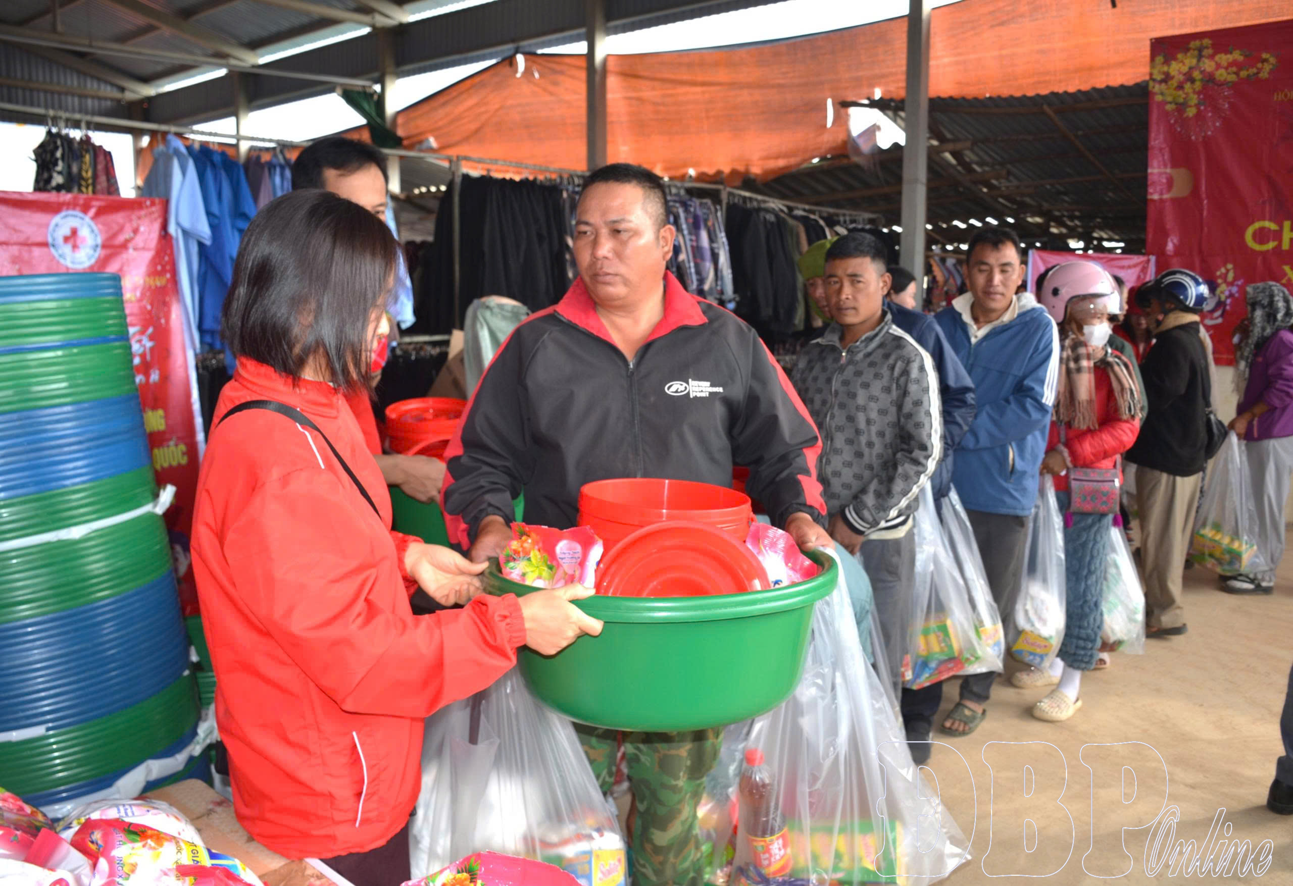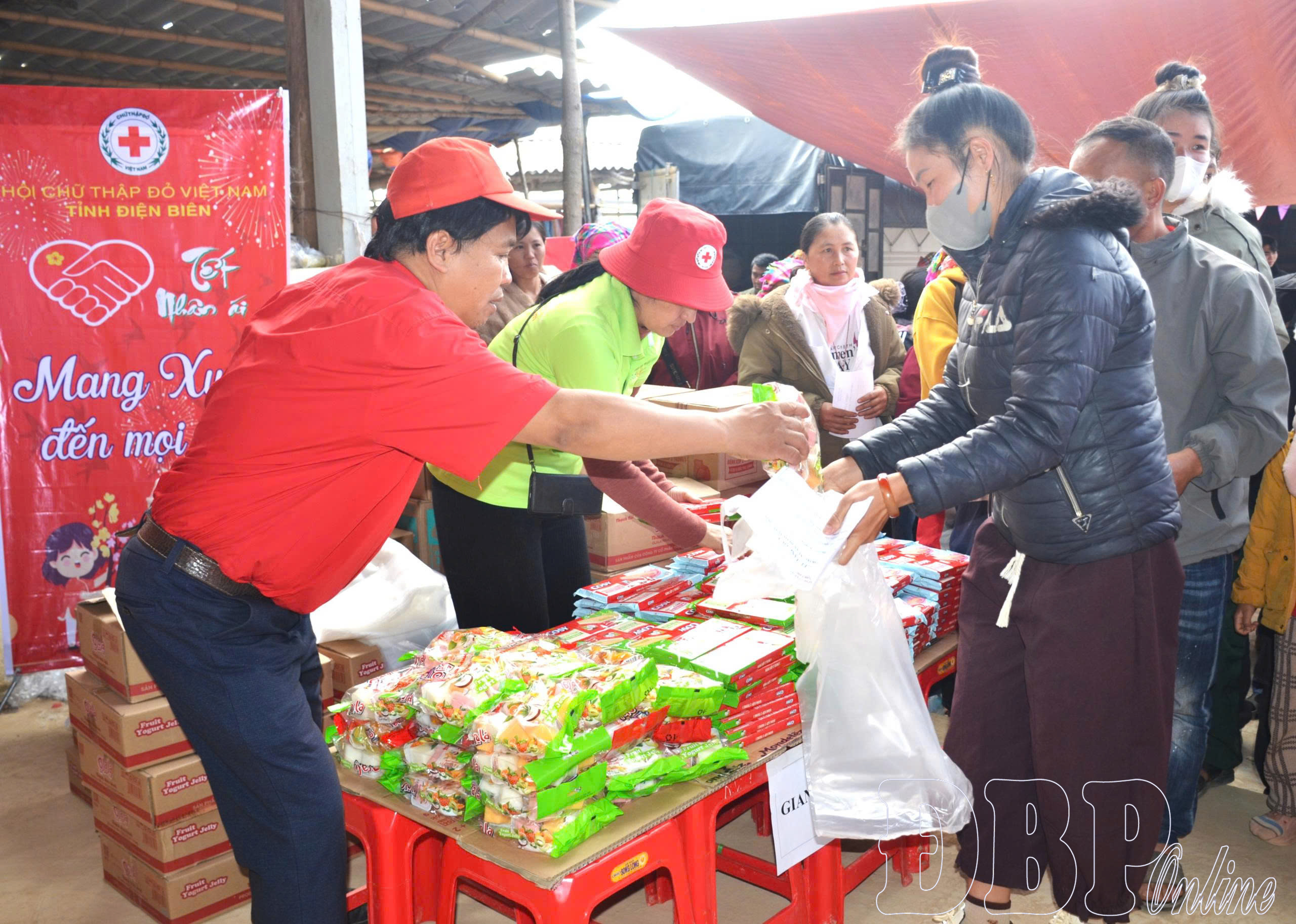 Đại diện Hội Chữ thập đỏ tỉnh trao những phần quà tại các gian hàng cho người dân.