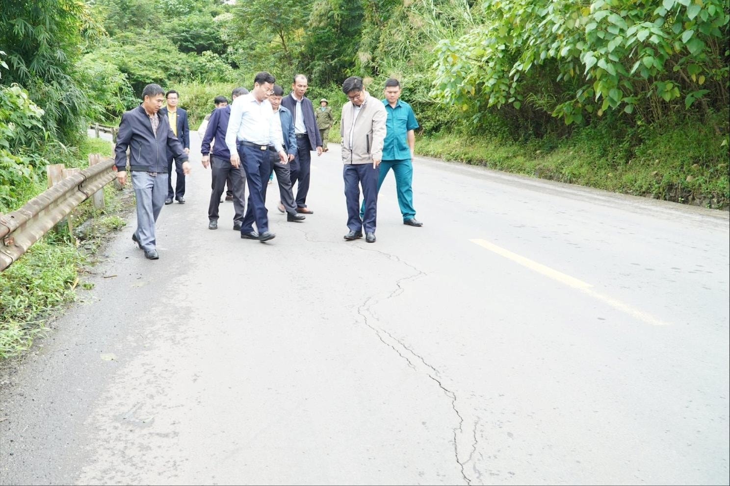 Phó Bí thư Tỉnh ủy, Chủ tịch HĐND tỉnh Lâm Đồng Lưu Văn Trung cùng Đoàn công tác khảo sát vết nứt trên Quốc lộ 28, đoạn qua đèo 52, xã Quảng Sơn. Ảnh tư liệu
