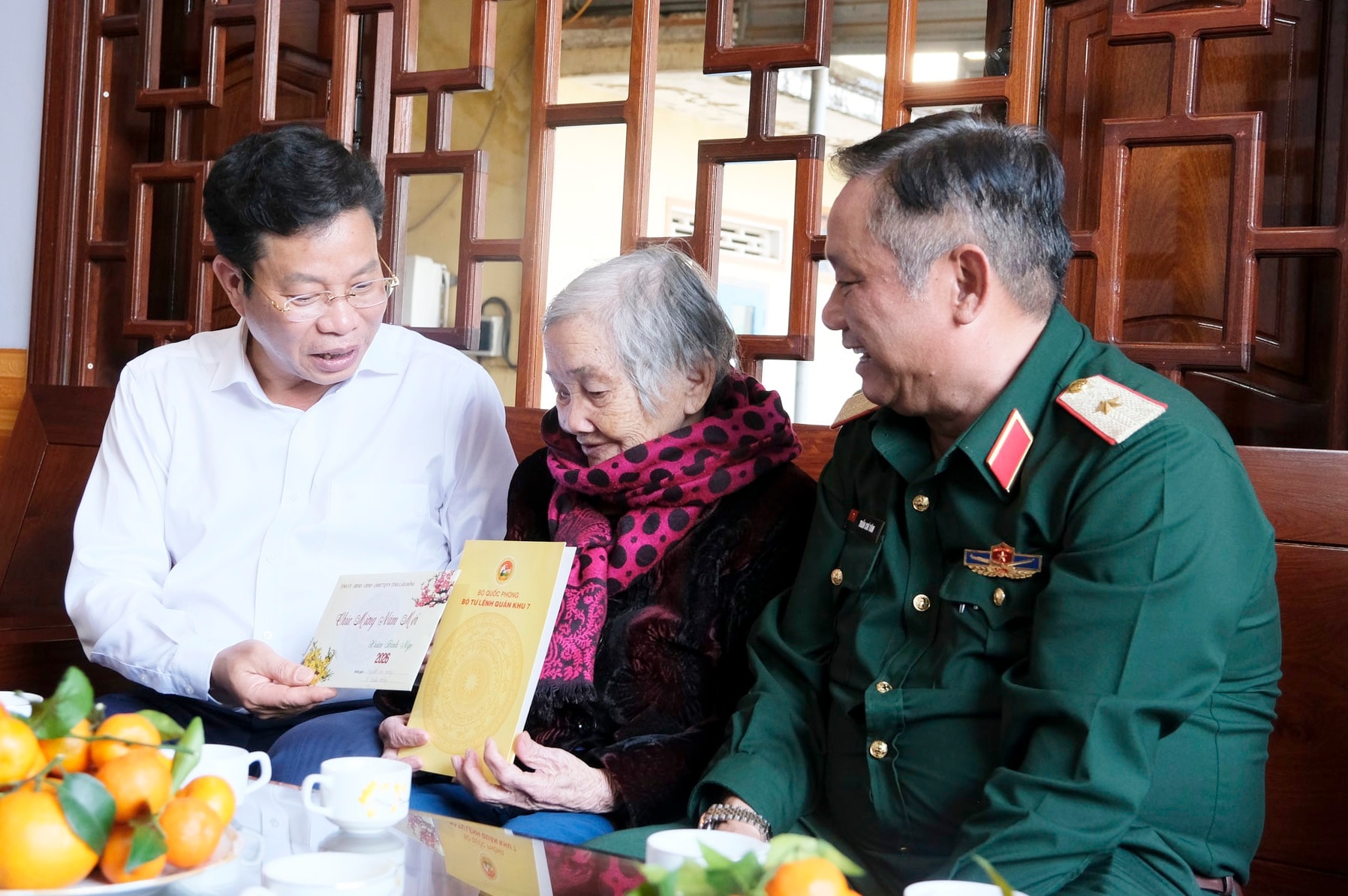 Thiếu tướng Trần Chí Tâm, Phó Chính ủy Quân khu 7 và đồng chí Lưu Văn Trung, Phó Bí thư Tỉnh ủy, Chủ tịch HĐND tỉnh Lâm Đồng chúc sức khỏe Mẹ Việt Nam Anh hùng Nguyễn Thị Xuân (Thôn 2, xã Thuận An). Ảnh tư liệu