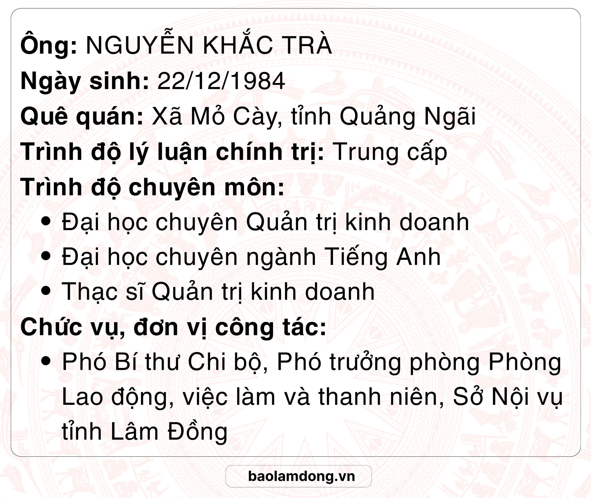 Chức vụ, đơn vị công tác: Phó trưởng phòng, Phòng Lao động, việc làm và Thanh niên, Sở Nội vụ tỉnh Lâm Đồng.