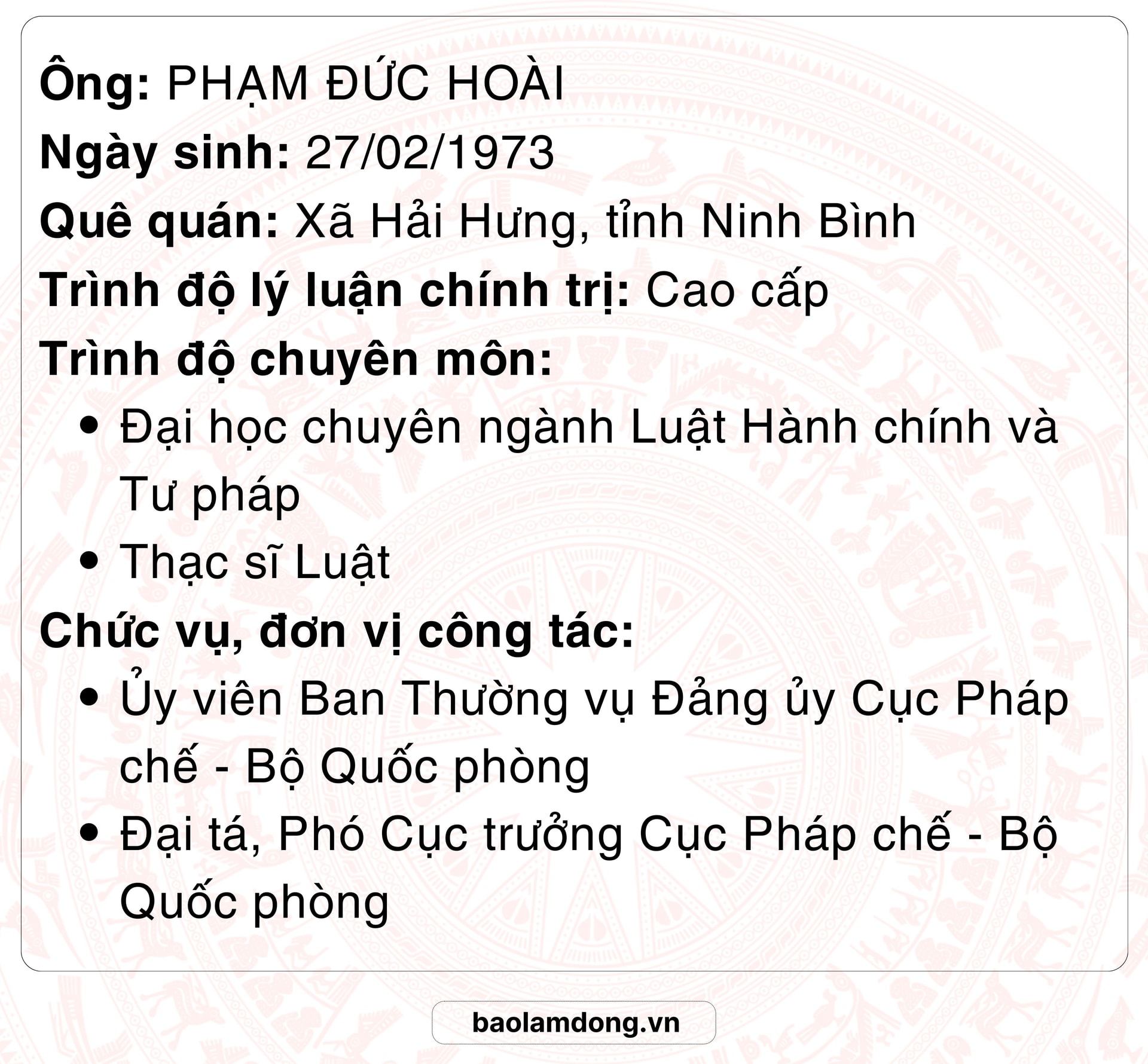Là sĩ quan trong Quân đội nhân dân Việt Nam, được đào tạo cơ bản qua nhiều trường trong và ngoài Quân đội, với 35 năm công tác trong Quân đội, trong đó có hơn 20 năm làm công tác pháp luật, hiện là Phó Cục trưởng Cục Pháp chế Bộ Quốc phòng, tôi đã trực tiếp chỉ đạo, hướng dẫn, tham gia xây dựng nhiều đạo luật và các văn bản liên quan đến quốc phòng, an ninh nói riêng và quản lý nhà nước nói chung.