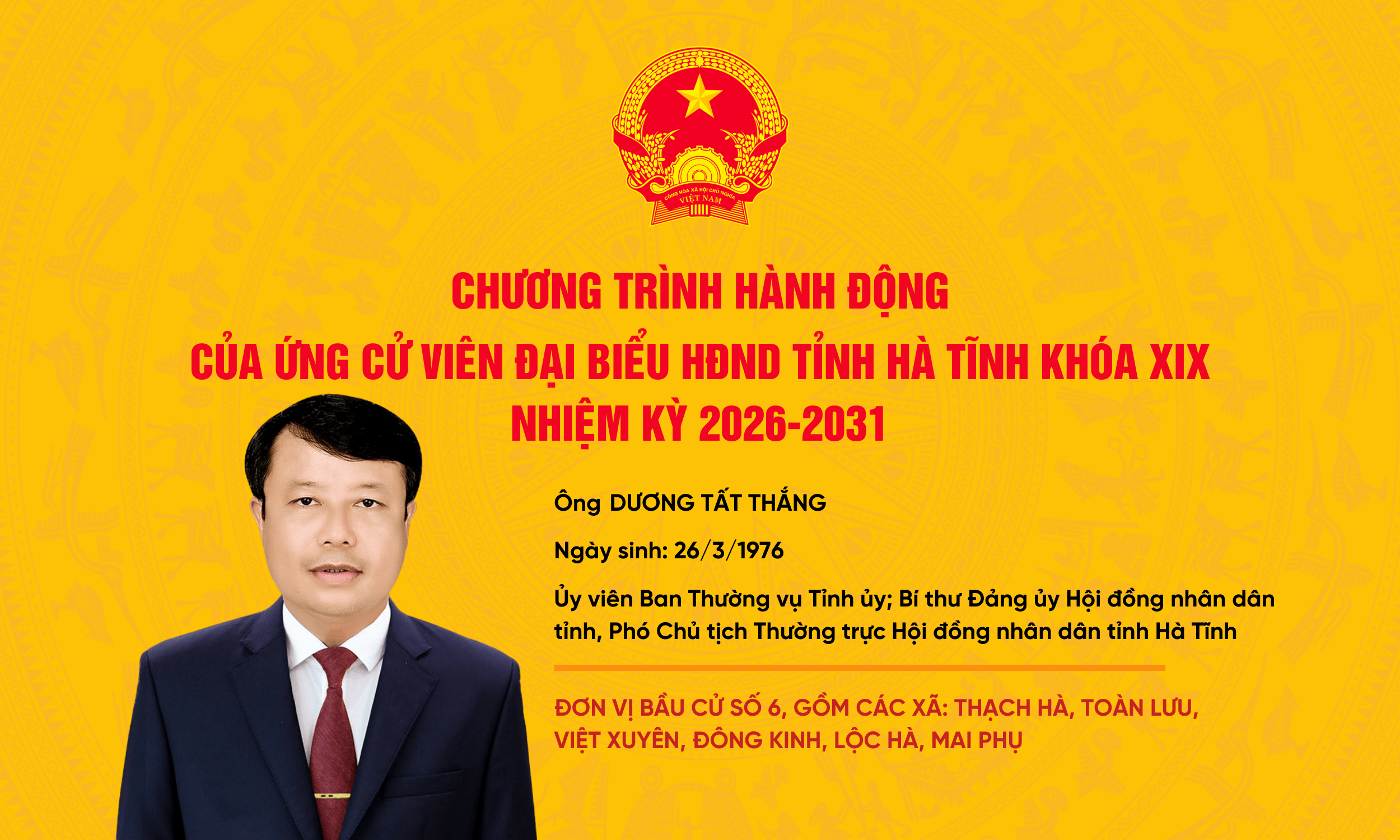 Nhiệm kỳ 2026-2031, tôi rất vinh dự được giới thiệu ứng cử đại biểu HĐND tỉnh tại đơn vị bầu cử số 6 gồm các xã: Thạch Hà, Toàn Lưu, Việt Xuyên, Đông Kinh, Lộc Hà và Mai Phụ. Đây vừa là niềm vinh dự, vừa là trách nhiệm lớn trước Đảng bộ và Nhân dân tỉnh nhà.