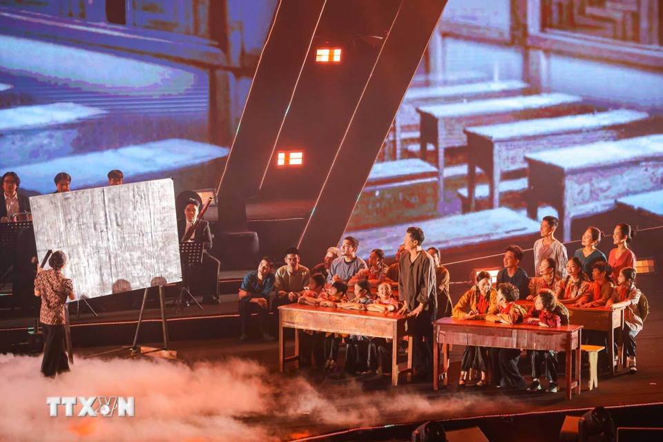Tiết mục khắc họa phong trào "Diệt giặc dốt" sau năm 1945. (Ảnh: Hoàng Hiếu/TTXVN)