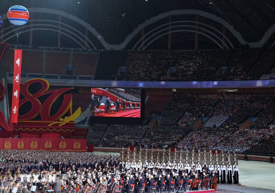Chương trình biểu diễn nghệ thuật kỷ niệm 80 năm thành lập Đảng Lao động Triều Tiên. (Ảnh: Thống Nhất/TTXVN)