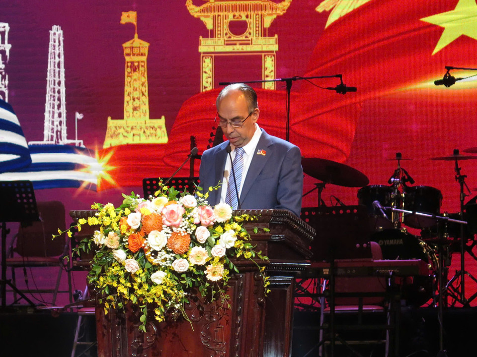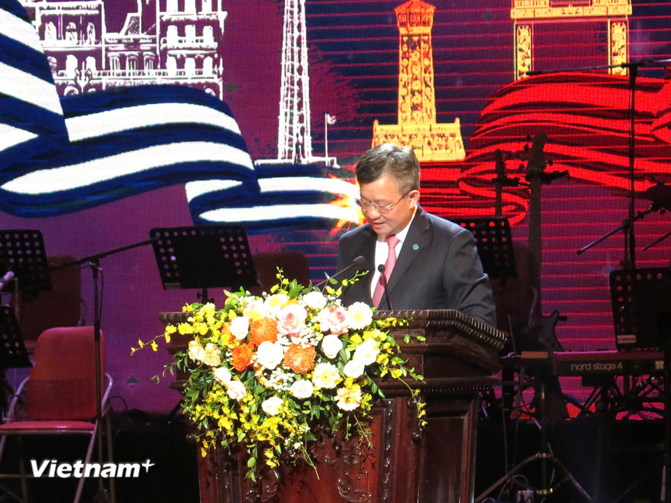Ông Nguyễn Ngọc Kỳ, Chủ tịch Liên hiệp các tổ chức Hữu nghị thành phố Hà Nội phát biểu khai mạc chương trình. Ông chia sẻ: “Chương trình mang trong mình ý nghĩa kết nối văn hóa thể hiện sự thủy chung, son sắt, nghĩa tình, thắt chặt tình hữu nghị và thúc đẩy sự hợp tác giữa hai nước.” (Ảnh: PV/Vietnam+)