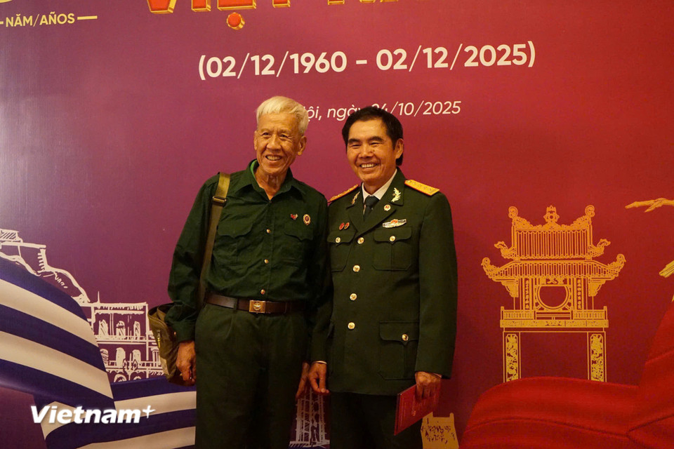 Các cựu chiến binh Việt Nam vui mừng gặp gỡ, chụp ảnh kỷ niệm bên lề chương trình kỷ niệm 65 năm thiết lập quan hệ ngoại giao Việt Nam-Cuba. (Ảnh: PV/Vietnam+)