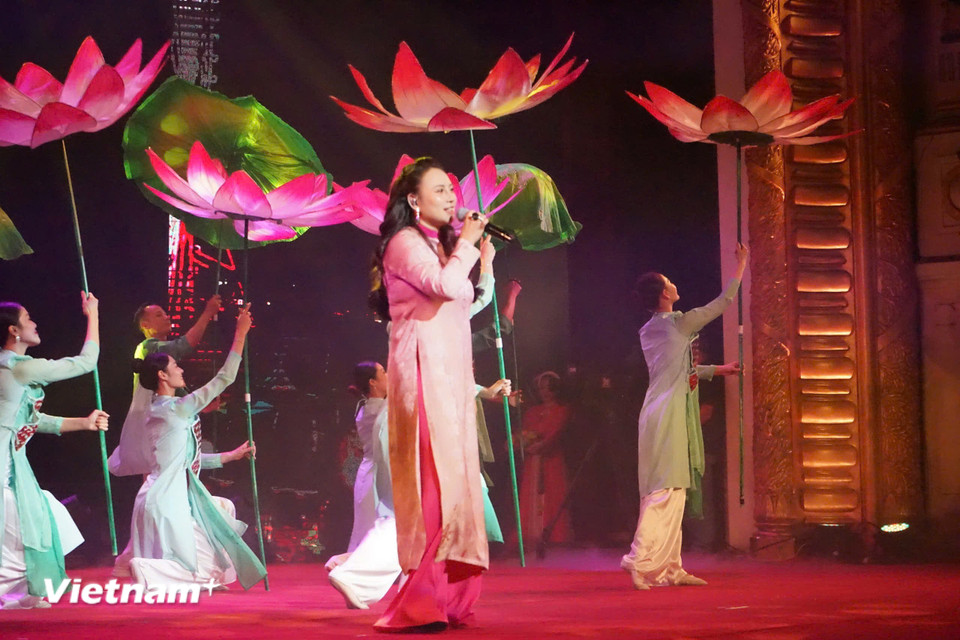 Tiết mục “Sen Việt” lấy cảm hứng hình ảnh hoa sen với những giai điệu trữ tình ngợi ca đất nước và con người Việt Nam. (Ảnh: PV/Vietnam+)