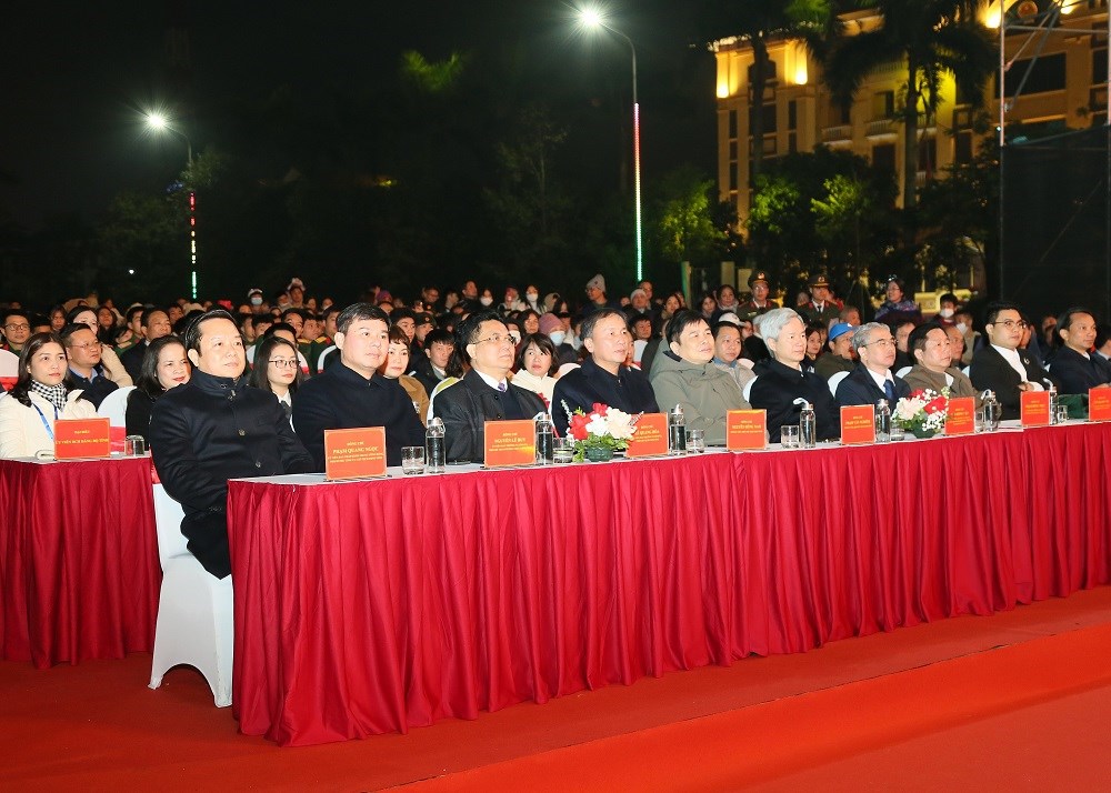 Kết thúc chương trình nghệ thuật là màn pháo hoa đặc sắc, thu hút sự quan tâm, theo dõi của đông đảo Nhân dân. Những chùm pháo hoa rực rỡ, lung linh trên bầu trời Phố Hiến không chỉ mang đến không khí vui tươi, phấn khởi trong những ngày đầu xuân mới mà còn là biểu tượng sinh động cho niềm tin son sắt của Nhân dân đối với Đảng và con đường đổi mới và phát triển đất nước.