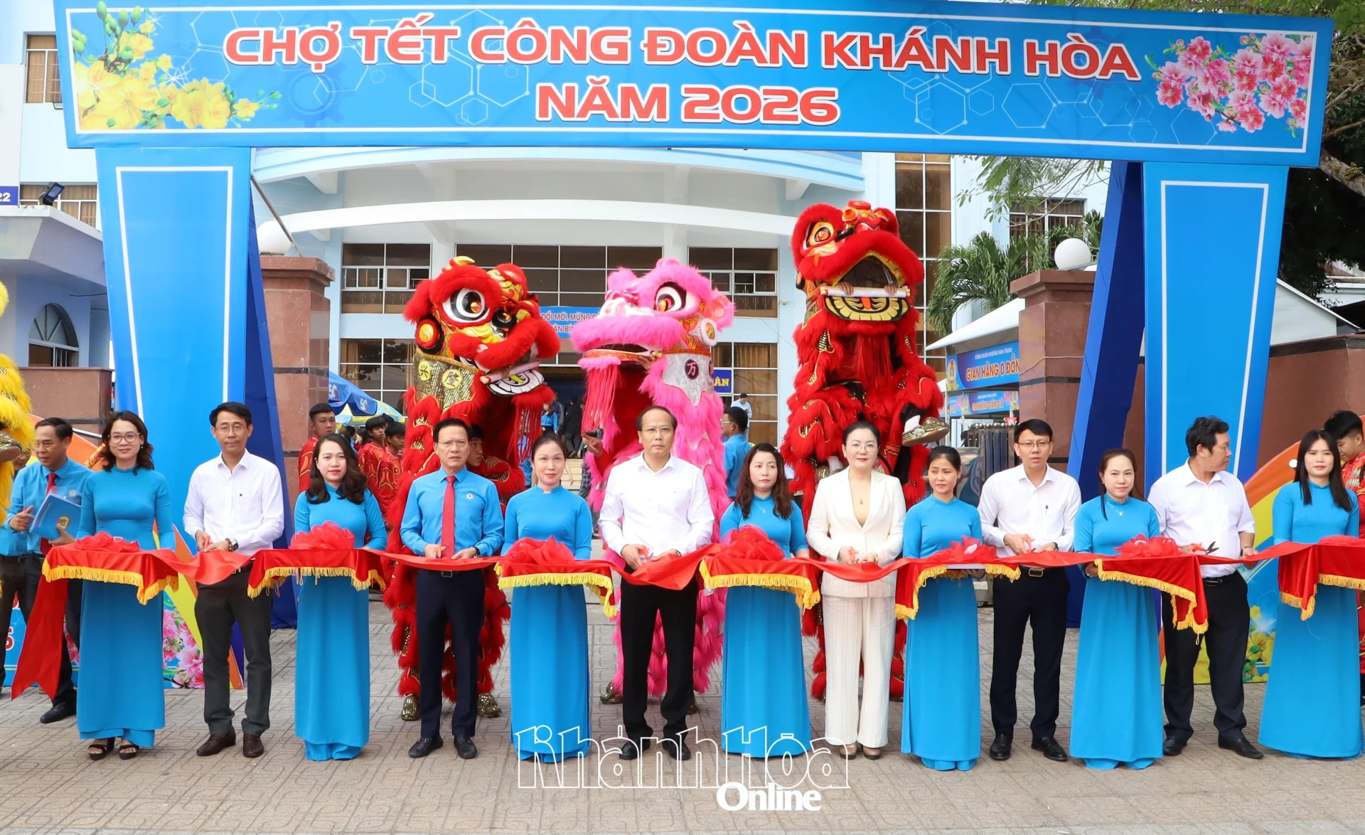 Đồng chí Nguyễn Khắc Hà và các đại biểu cắt băng khai trương Chợ Tết Công đoàn năm 2026.