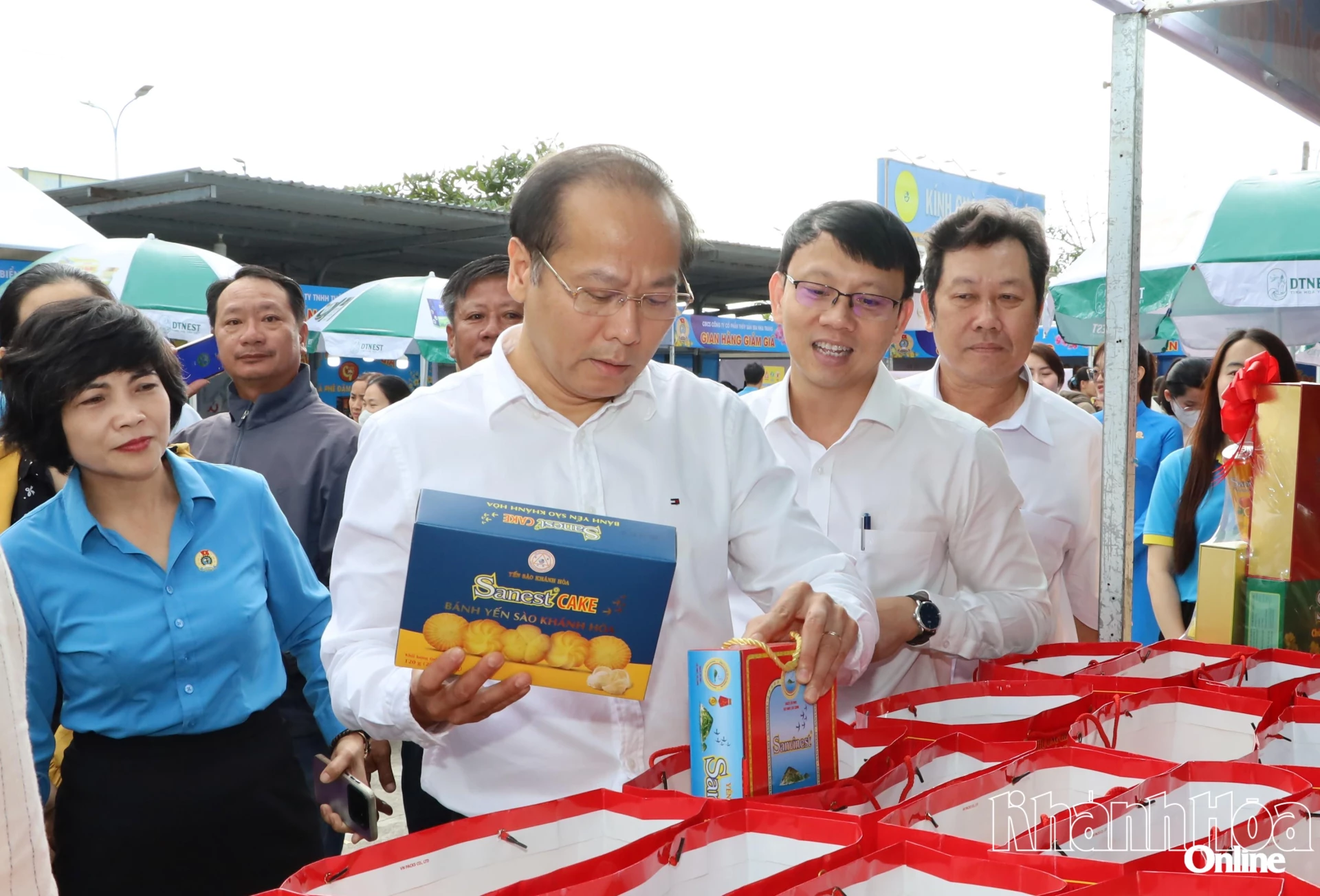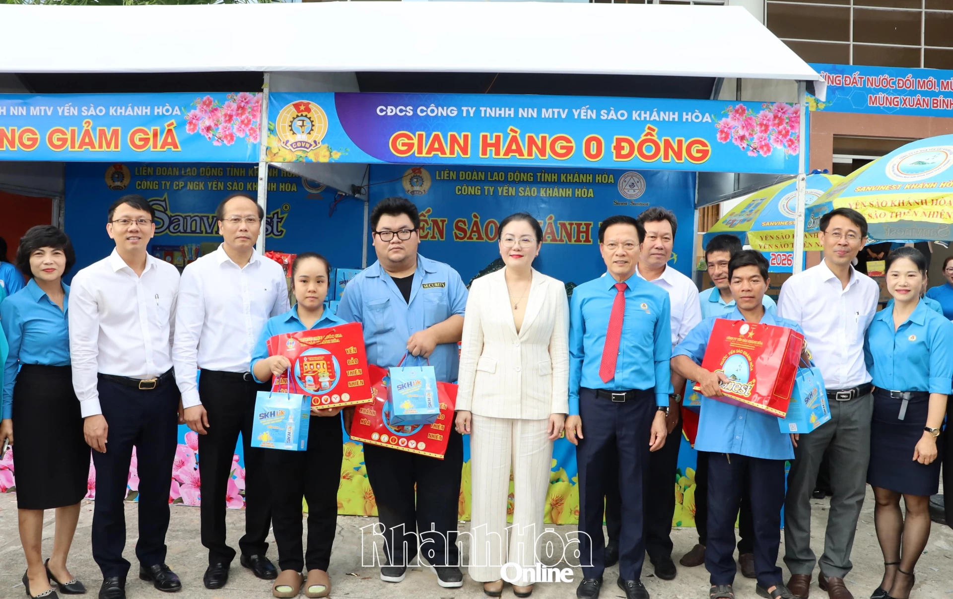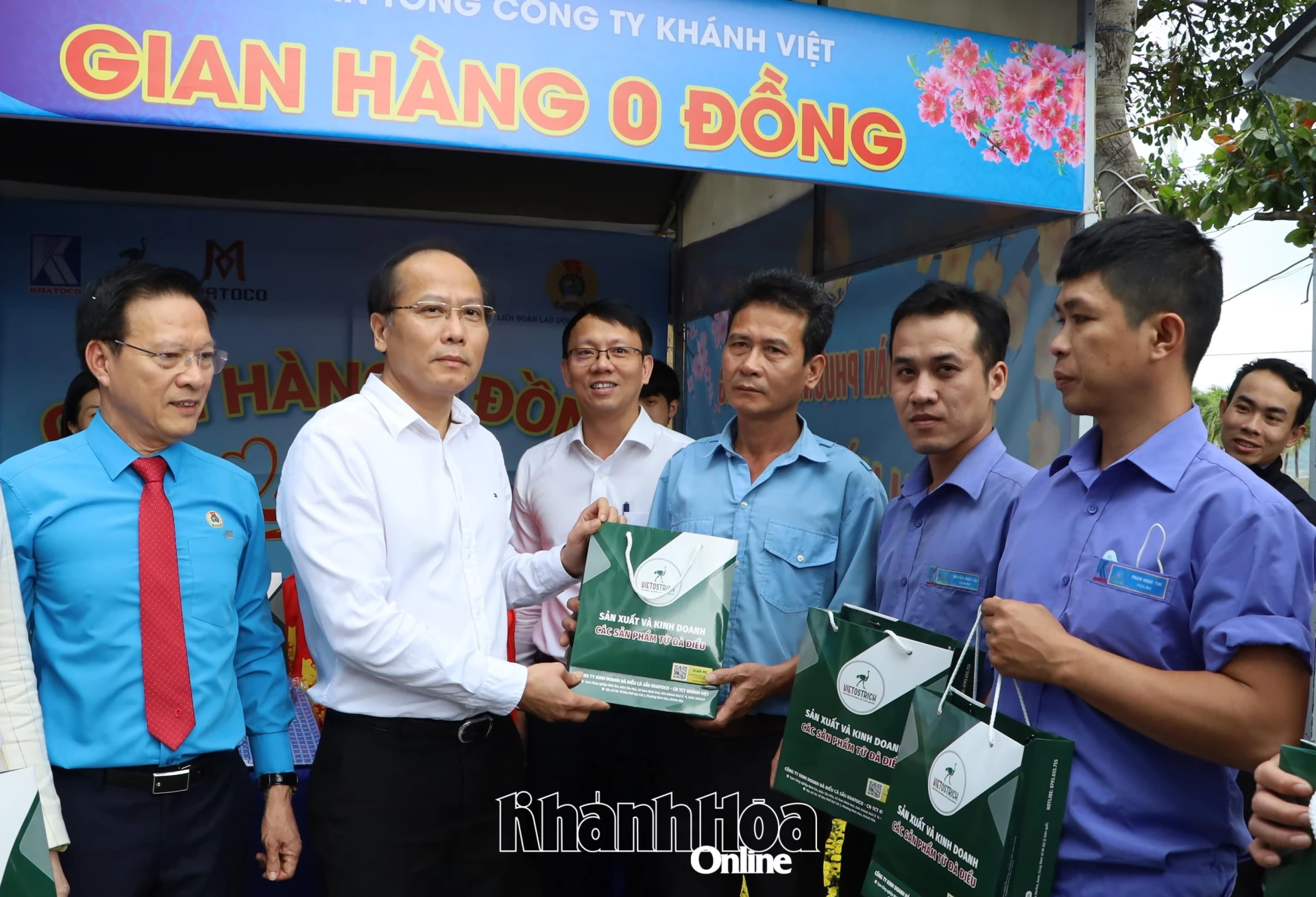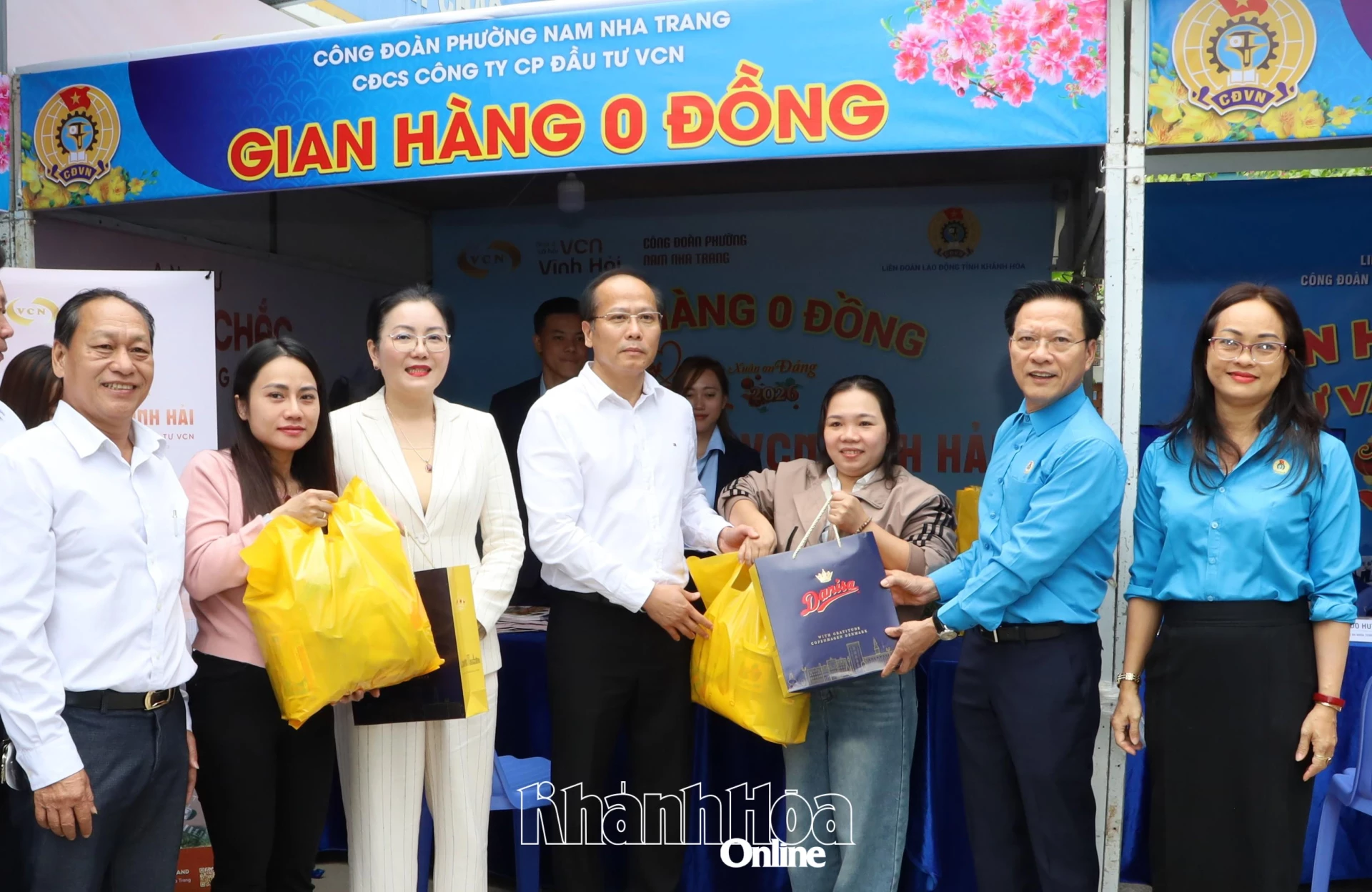 Đồng chí Nguyễn Khắc Hà và các đại biểu tặng quà cho người lao động tại gian hàng 0 đồng của Công đoàn cơ sở Công ty TNHH Nhà nước Một thành viên Yến sào Khánh Hòa.