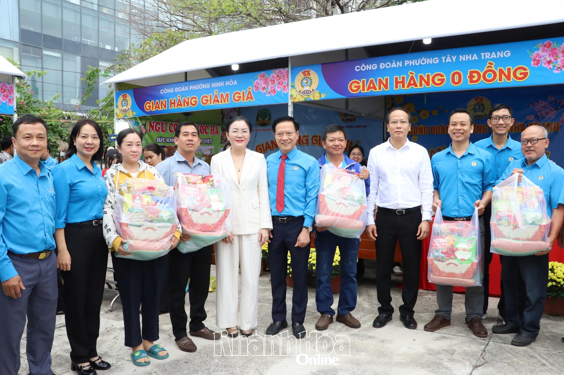 Các đại biểu tặng quà cho đoàn viên, người lao động tại gian hàng 0 đồng của Công đoàn phường Tây Nha Trang.