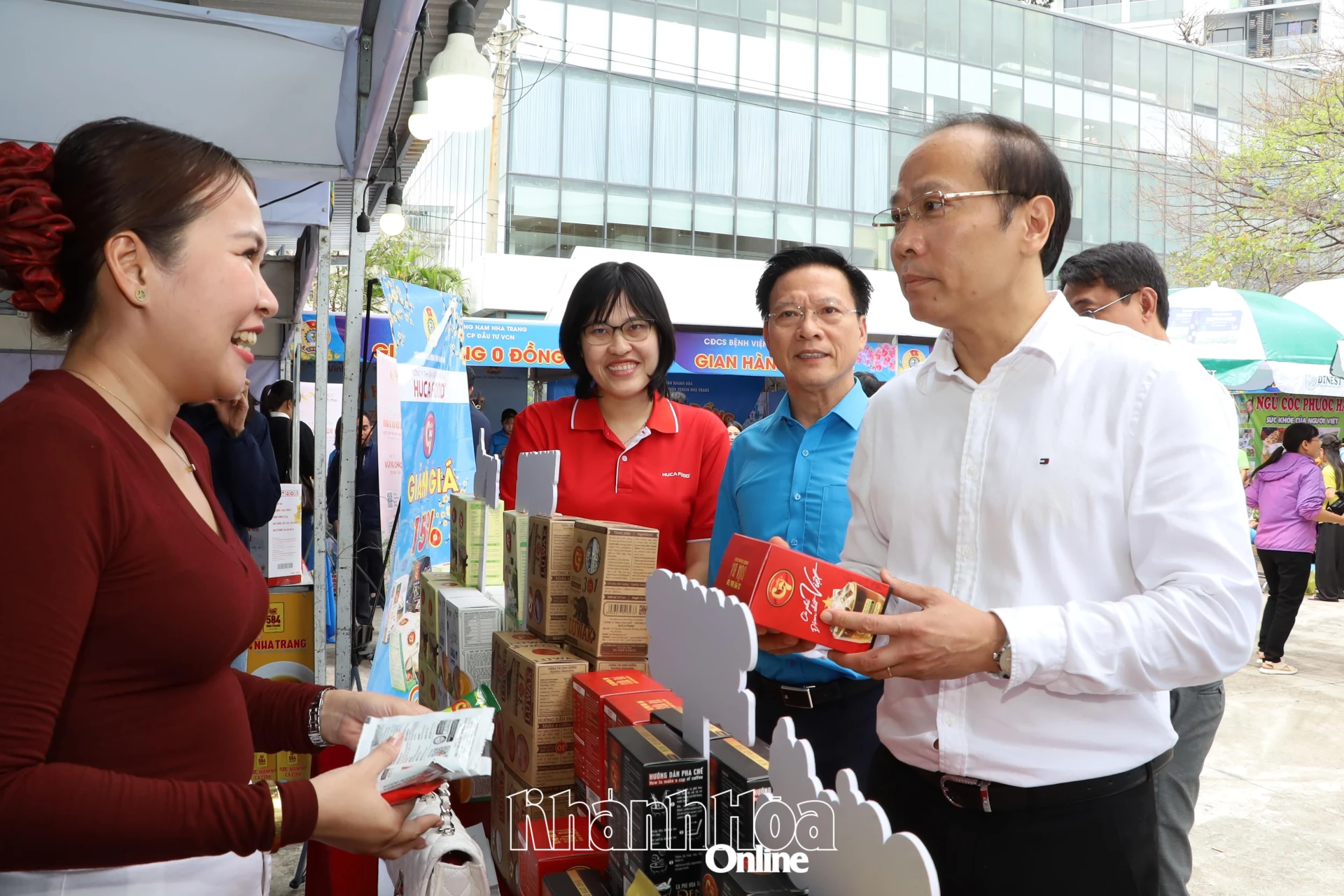 Đồng chí Nguyễn Khắc Hà kiểm tra các sản phẩm tại gian hàng giảm giá.