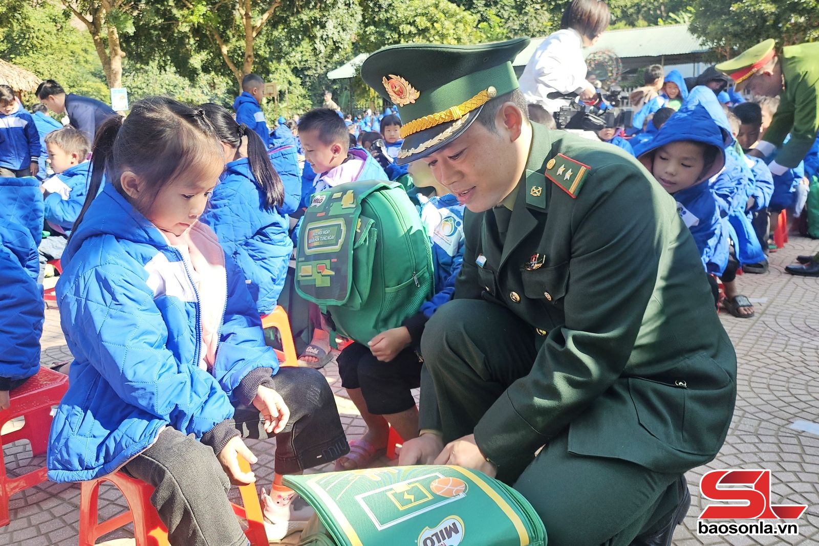 Đại diện cán bộ, chiến sĩ Đồn Biên Phòng Mường Cai trao quà cho các em học sinh.