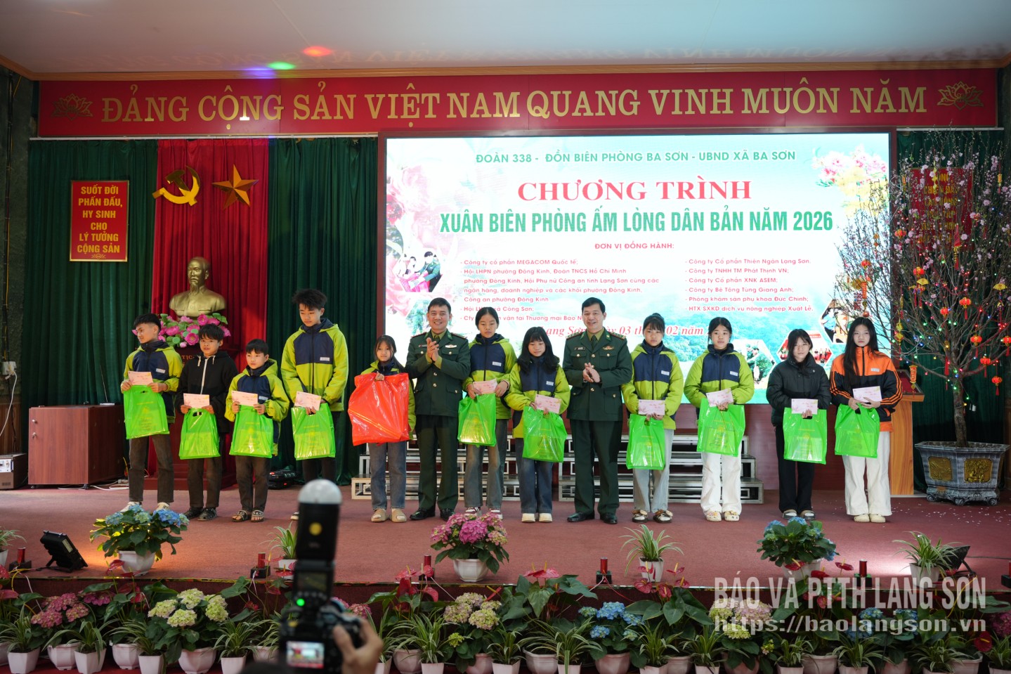 Đại diện Ban Chỉ huy Bộ đội biên phòng và Đồn Biên phòng Ba Sơn tặng quà cho học sinh thuộc chương trình Nâng bước em tới trường và Con nuôi đồn biên phòng
