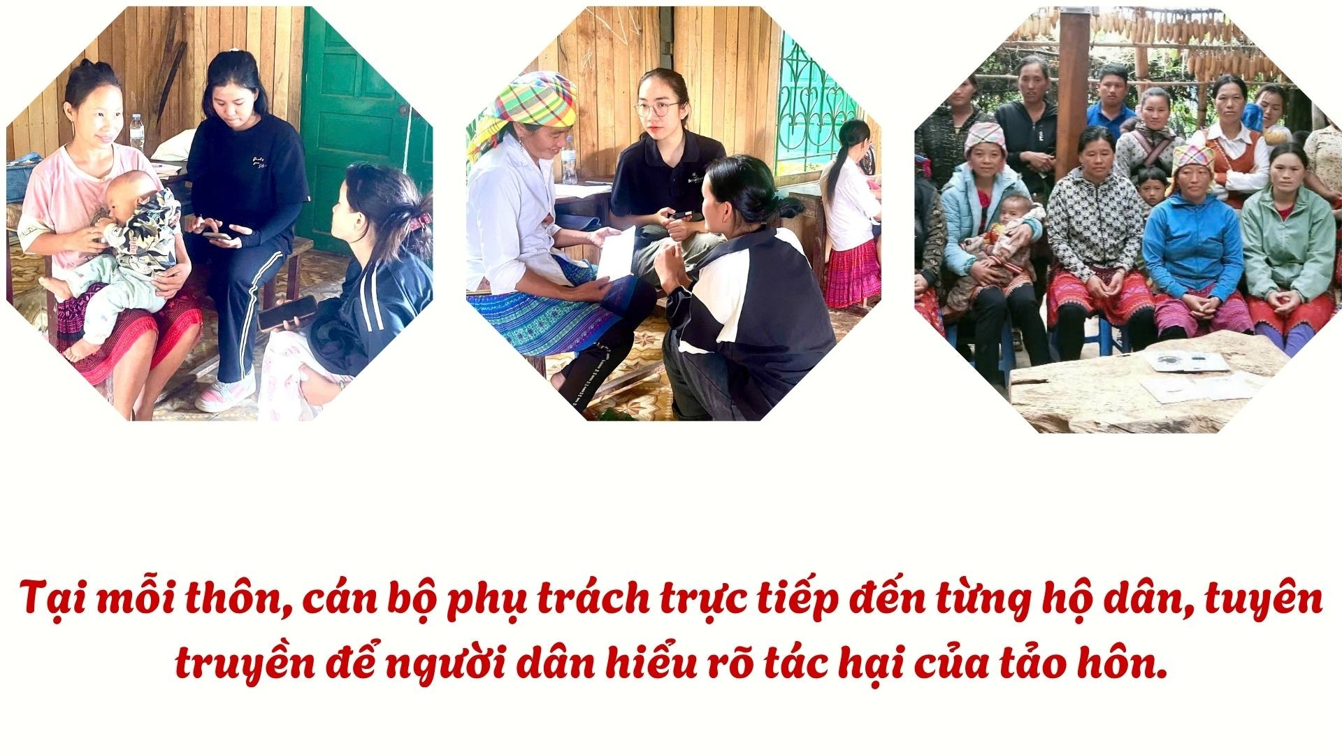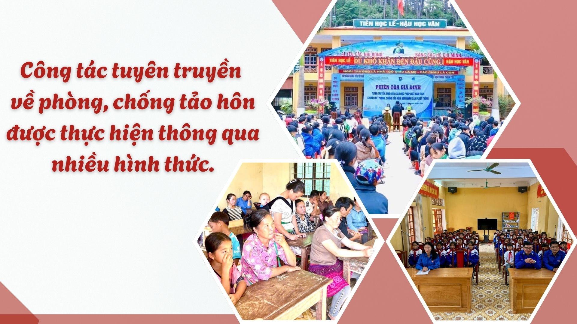 Hệ thống loa truyền thanh, họp thôn bản, tờ rơi song ngữ, pa-nô, áp phích được phát huy tối đa. Tại mỗi thôn, cán bộ phụ trách trực tiếp đến từng hộ dân, vận động, giải thích để người dân hiểu rõ tác hại của tảo hôn và quy định của pháp luật.