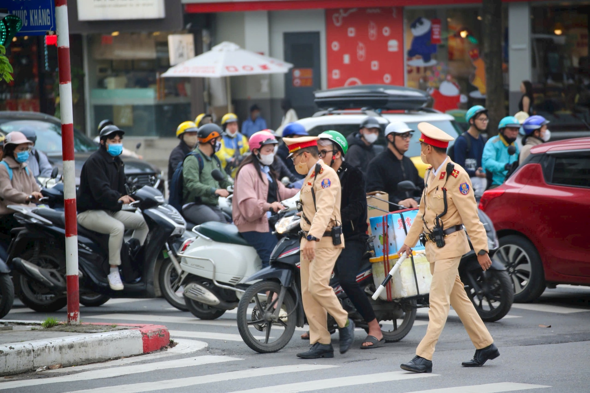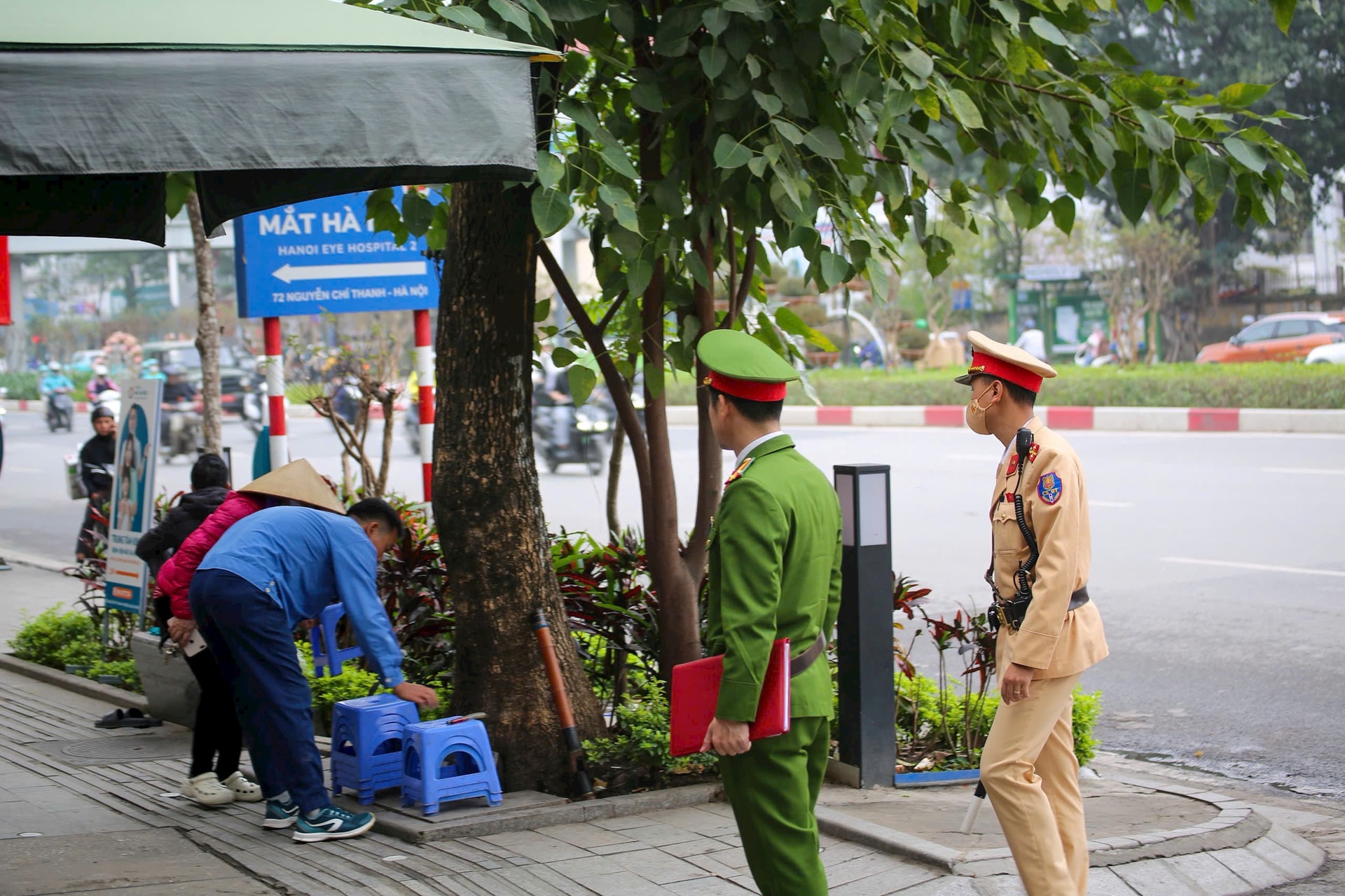 Đội Cảnh sát giao thông đường bộ số 3 và Công an phường Láng nhắc nhở công tác trật tự đô thị trên tuyến đường Nguyễn Chí Thanh, sáng 27-2. Ảnh: MH