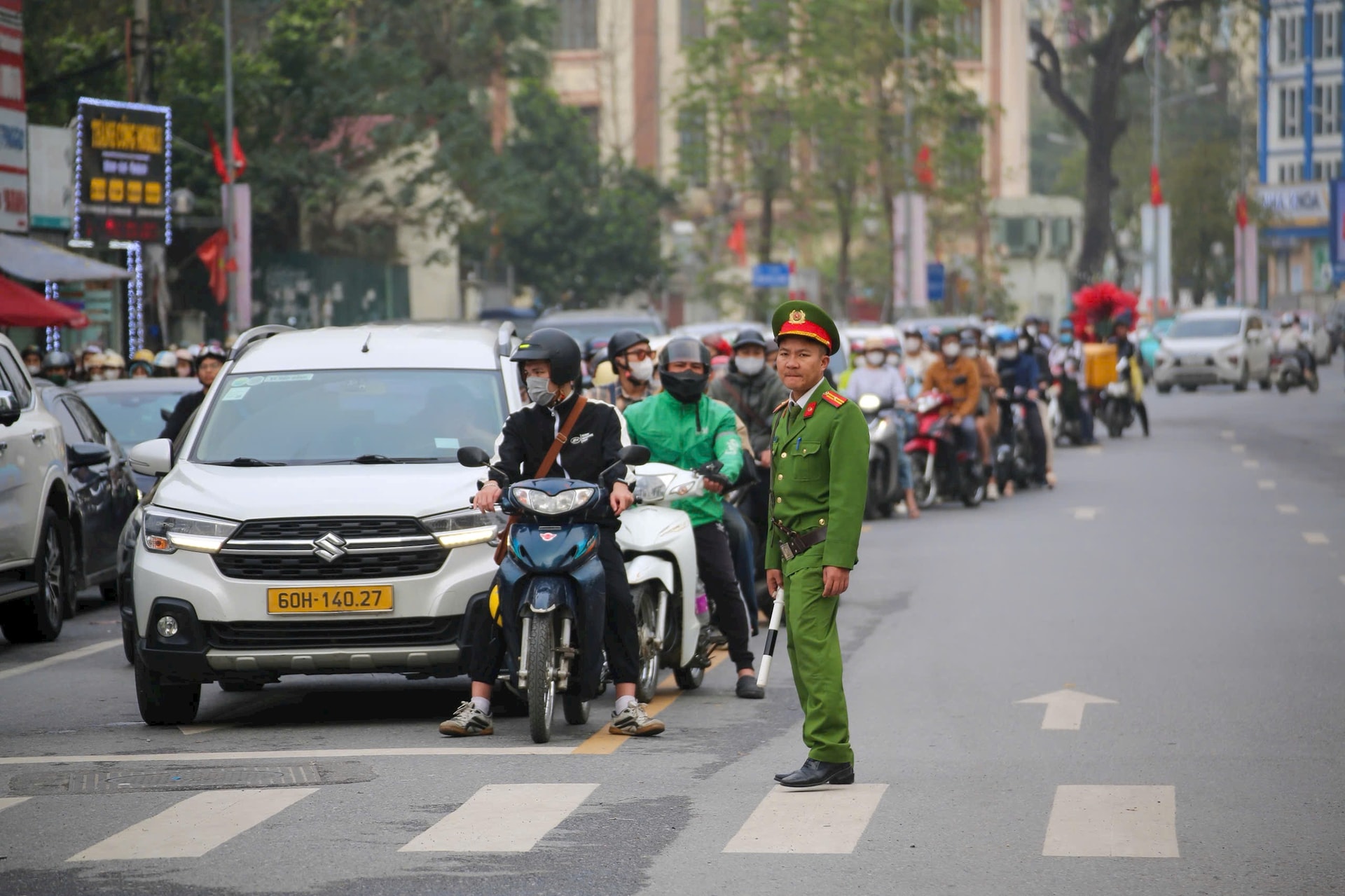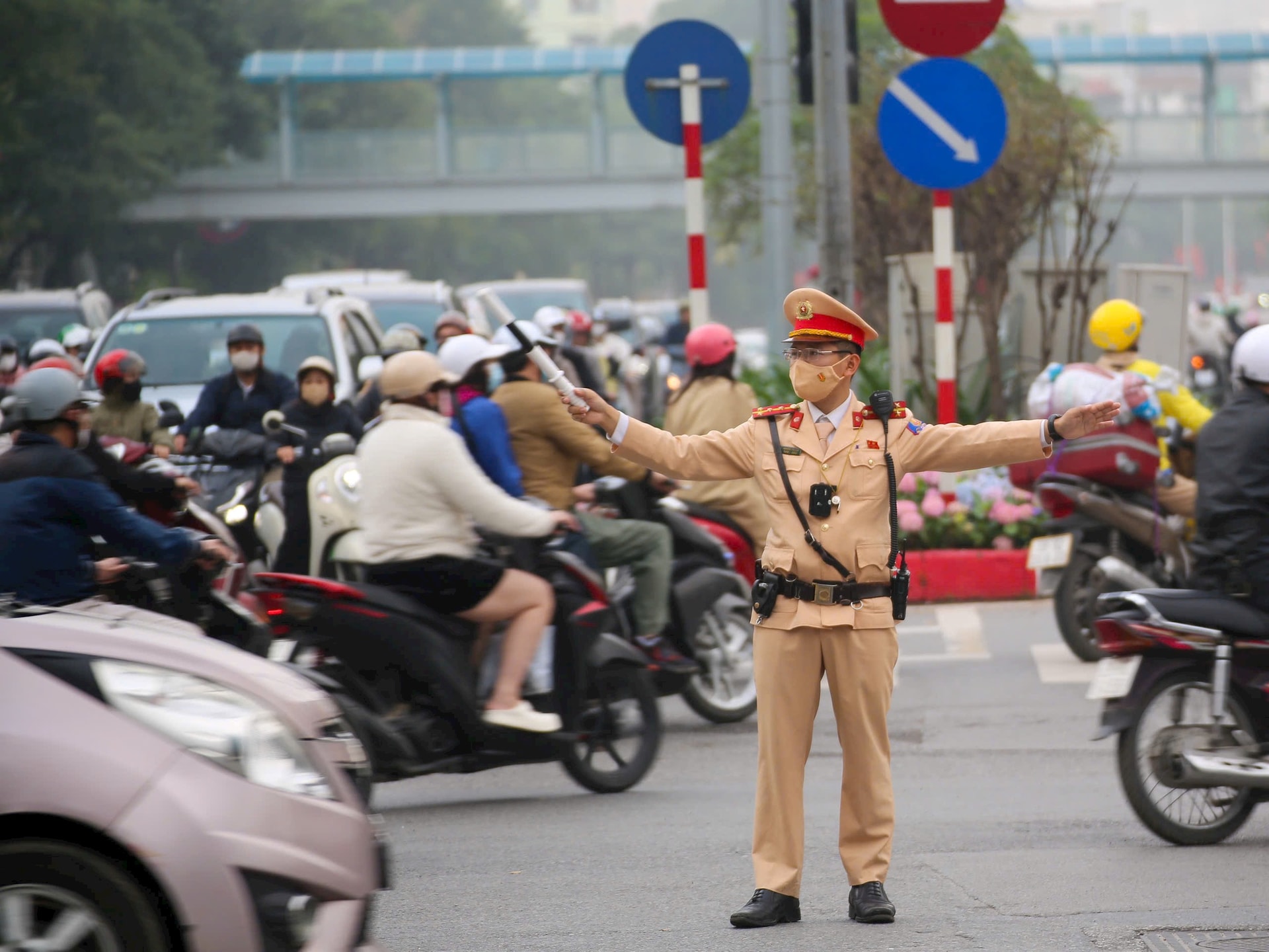 Đội Cảnh sát giao thông đường bộ số 3 và Công an phường Láng bảo đảm trật tự an toàn giao thông trên tuyến đường Nguyễn Chí Thanh trong giờ cao điểm sáng 27-2. Ảnh: MH
