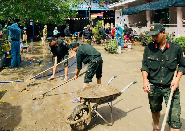 Nạo vét bùn đất, tẩy rửa vệ sinh Trường Mầm non Hòa Bình 1, xã Tây Hòa.