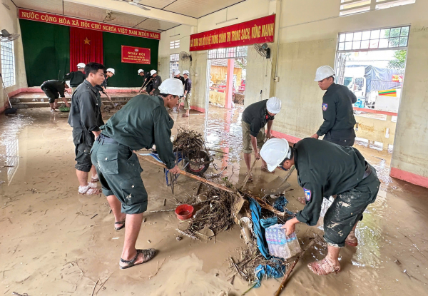 Nước rút xuống dần, 350 CBCS Phòng CSCĐ Công an tỉnh Đắk Lắk vẫn bám trụ những nơi cơn lũ đi qua, tất bật cuốc, xẻng, dao, rựa, xe rùa, cưa máy cầm tay… xuyên suốt 4 ngày (23/11-26/11), thu gom rác bẩn, cây cối, khai thông các tuyến giao thông với tổng chiều dài 68,5km; nạo vét, tẩy rửa bùn đất, thu dọn vật liệu đổ nát ở 56 trường học, 19 công sở, 178 căn nhà dân; xử lý vệ sinh môi trường hơn 190 tấn rác bẩn, bùn đất, phế liệu; giúp dân vận chuyển hơn 12 tấn lúa ngập nước đi phơi; hỗ trợ mai táng 2 người chết do lũ lụt…