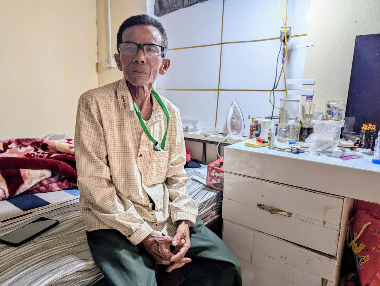 Cuộc trò chuyện của chúng tôi bất ngờ bị ngắt quãng bởi tràng ho kéo dài. Ông đứng dậy một cách khó nhọc, một tay bám vào cạnh bàn, một tay vươn ra với lấy cốc nước rồi tu một hơi cạn sạch để như để lấy lại sức lực. Lúc này, nhìn lên chiếc bàn nhỏ đặt cạnh đầu giường nơi ông Sơn ngồi, tôi không khỏi bất ngờ khi chứng kiến cảnh khắp mặt bàn là la liệt các chai lọ, vỉ thuốc và cả một cốc cháo loãng đang ăn dở. Bất giác bắt gặp ánh mắt ngạc nhiên của tôi, ông Sơn nói với chầm chậm nói: Tôi bị tắc nghẽn đường hô hấp gần chục năm nay. Cách đây 3 năm lại bị Zona thần kinh liệt nửa khuôn mặt. Chữa nhiều nơi rồi nhưng bác sĩ bảo chấp nhận sống chung với bệnh tật cả đời”. Nói đoạn, ông Sơn đưa tay sờ lên bên trái khuôn mặt cấu nhẹ rồi thở dài: “Bây giờ cào cấu thế nào cũng không có cảm giác gì hết. Ăn uống vì thế cũng khó khăn lắm. Giờ tôi chỉ uống sữa, ăn cháo loãng với ruốc thịt nạc”.