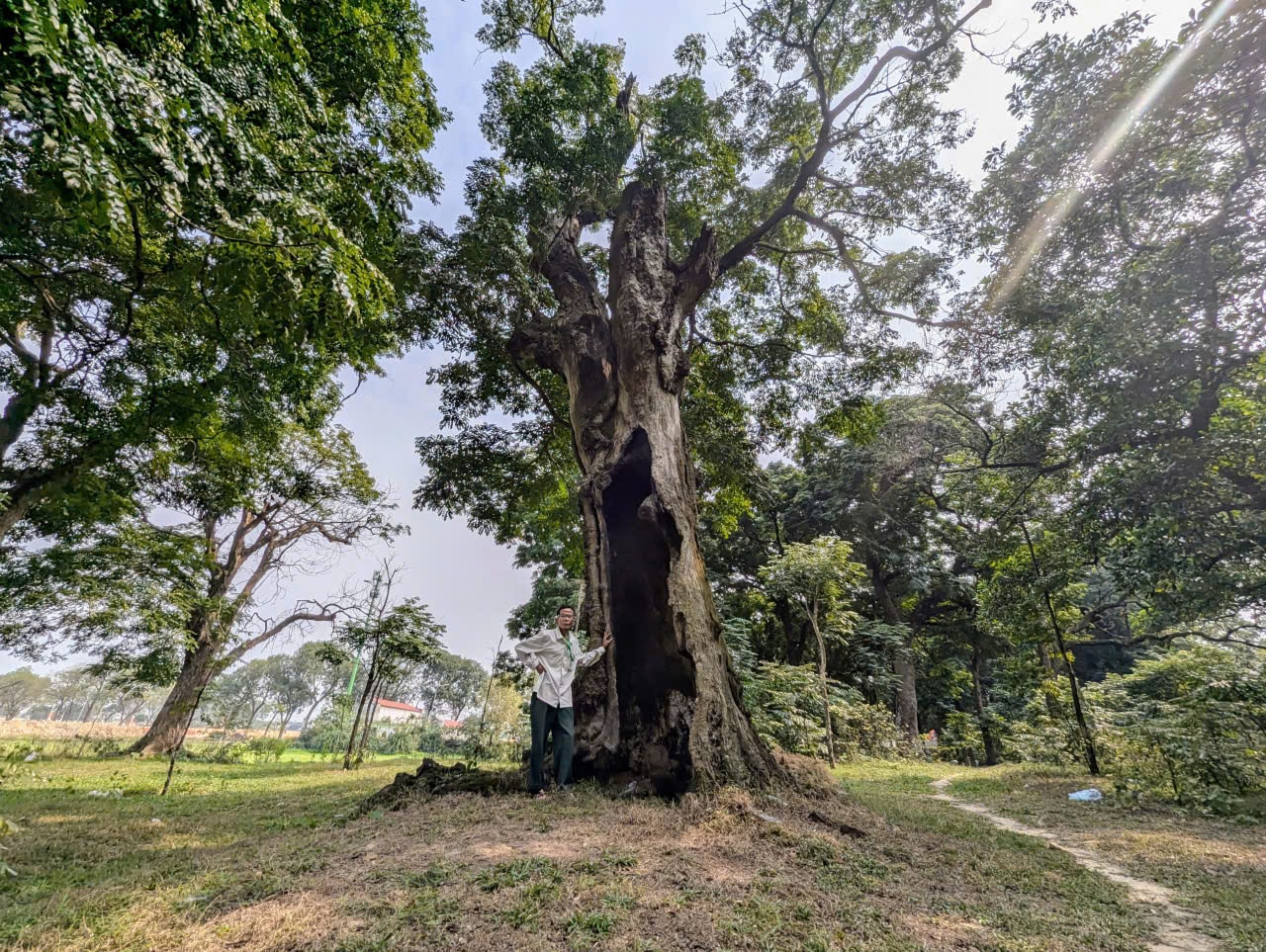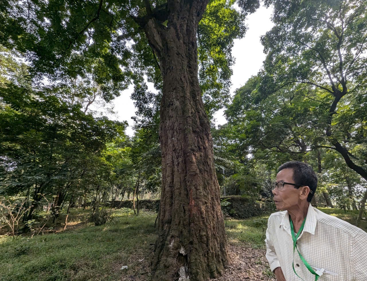 Ông Chu Văn Sơn bên một cây lim cổ thụ có "tuổi đời" thuộc hàng lâu nhất và cũng có sức sống mãnh liệt nhất tại "Rừng cây di sản đền Và". Cây lim từng bị trúng bom trong cuộc kháng chiến chống Pháp xâm lược nhưng bằng một cách thần kỳ nào đó, cây vẫn sống và sinh trưởng mãnh liệt đến tận bây giờ. Ảnh: Nguyễn Quý