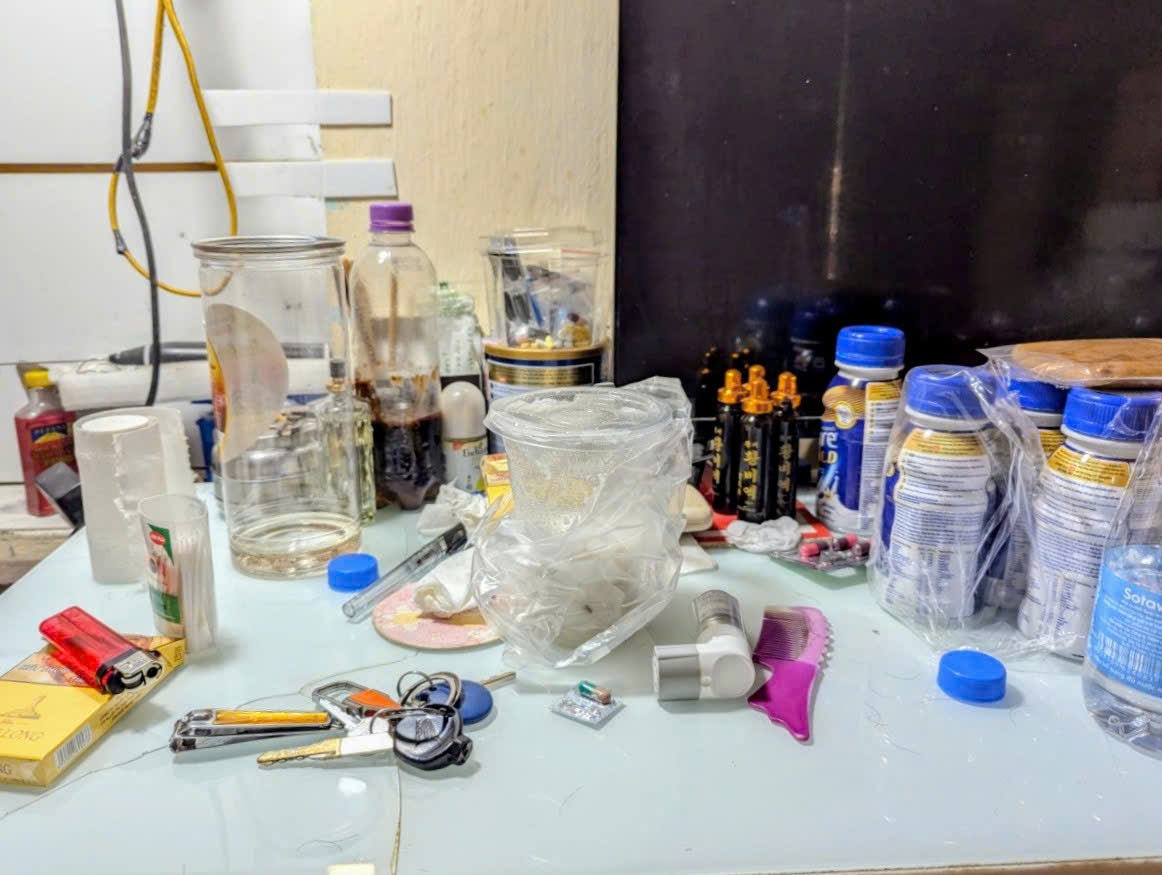Chiếc bàn làm việc ngổn ngang các loại thuốc, sữa trong phòng ở của ông Chu Văn Sơn. Ảnh: Nguyễn Quý