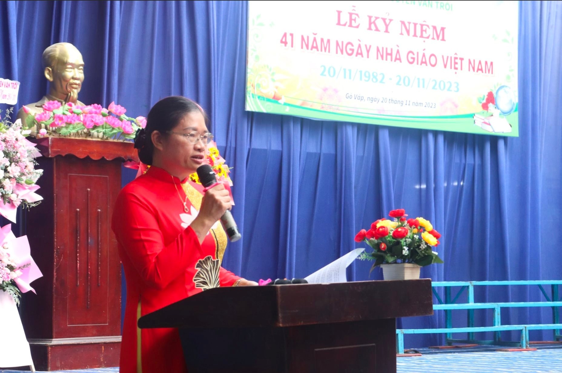 Cô Nguyễn Thị Ngọc Ánh - Hiệu trưởng Trường THCS Nguyễn Văn Trỗi đọc truyện cho học sinh nghe sau buổi chào cờ.