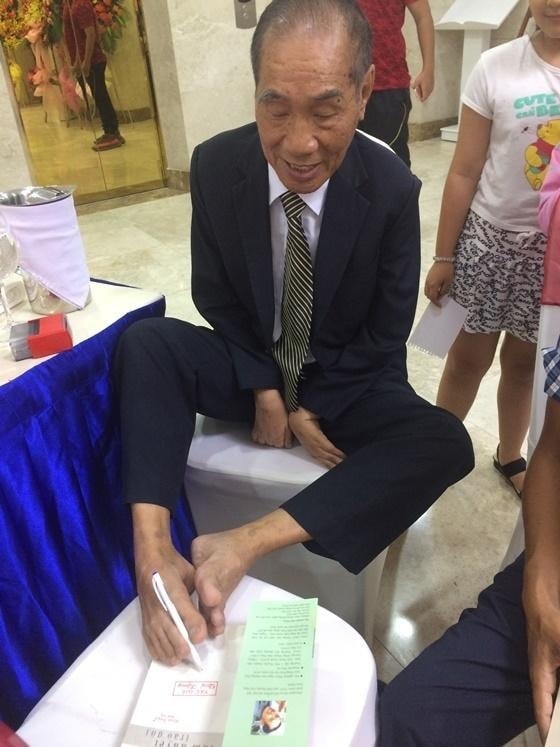 Thầy Nguyễn Ngọc Ký khi về già vẫn dùng chân ký sách tặng các bạn đọc.