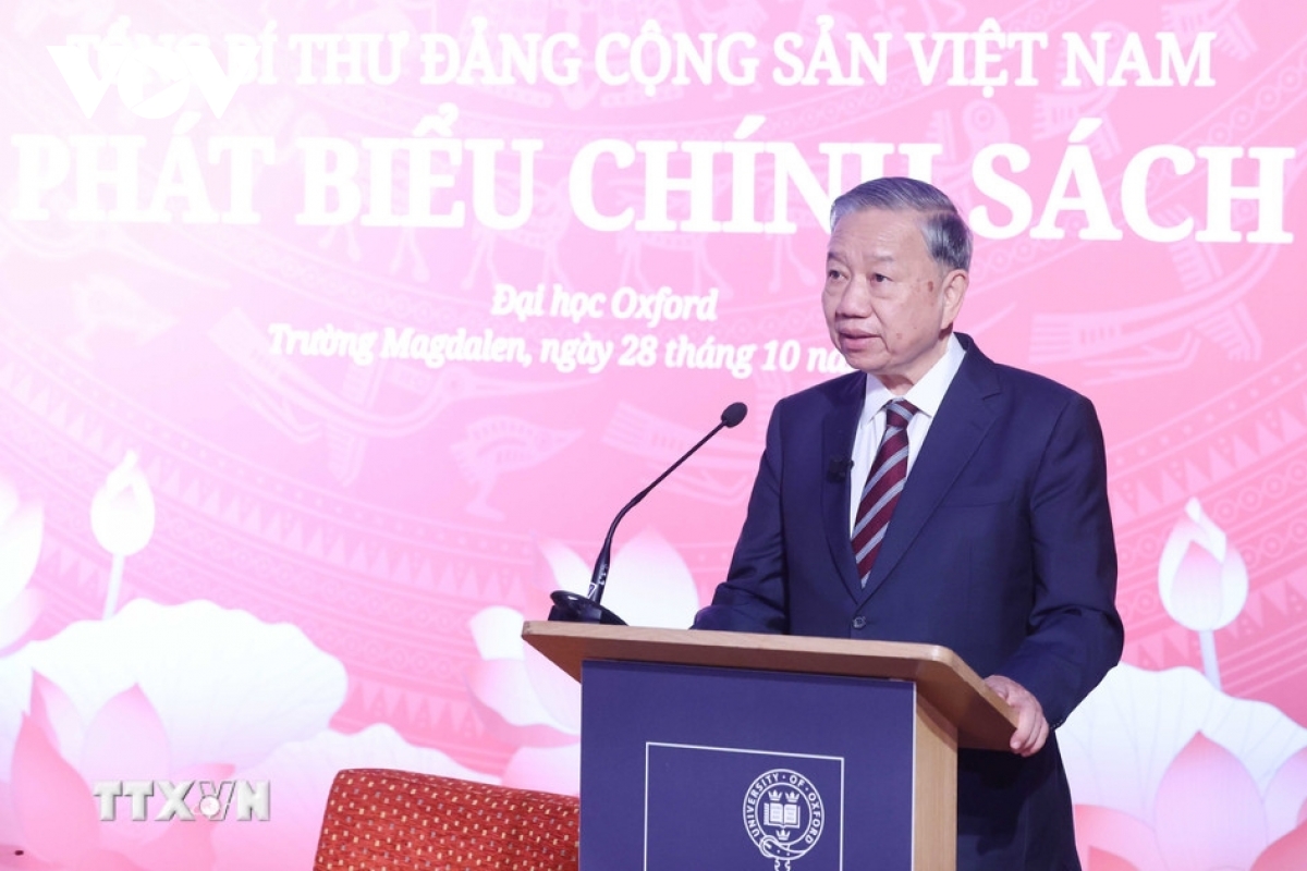 Tổng Bí thư Tô Lâm phát biểu chính sách tại Đại học Oxford. (Ảnh: TTXVN)