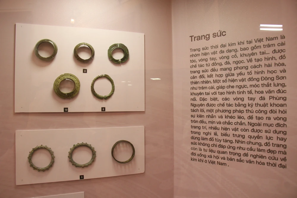 Nhóm “Vẻ đẹp con người Đông Sơn” giới thiệu các loại trang sức như vòng tay, khuyên tai, trâm cài tóc, hạt chuỗi, qua đó phản ánh quan niệm thẩm mỹ, đời sống tinh thần và sự phân tầng xã hội.
