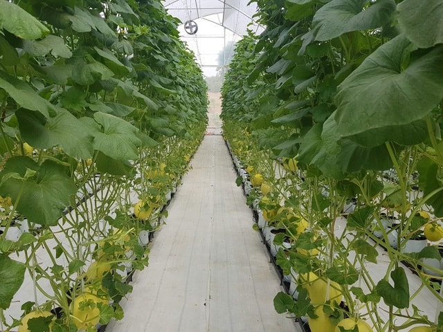Trồng dưa lưới trong nhà kính, ứng dụng công nghệ tưới phun tự động mang lại hiệu quả cao. Ảnh: Thiện Tâm