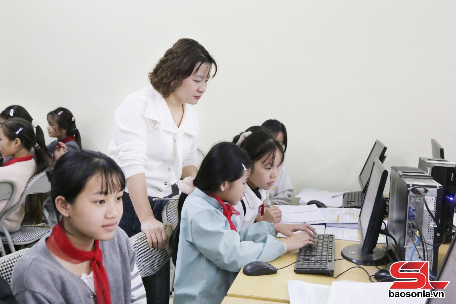 Giáo viên Trường Tiểu học Mường Khoa, xã Tạ Khoa hướng dẫn học sinh cách làm bài trên máy tính.