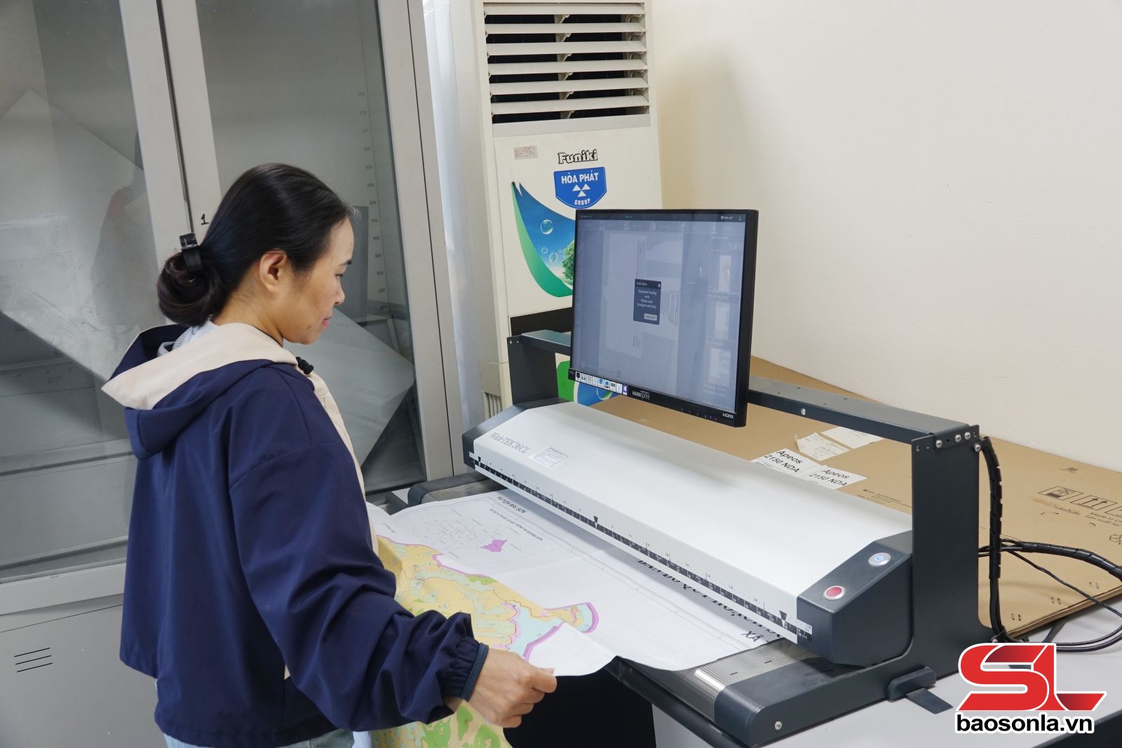 Cán bộ Trung tâm Chuyển đổi số và Thông tin dữ liệu thực hiện quét số hóa bản đồ.
