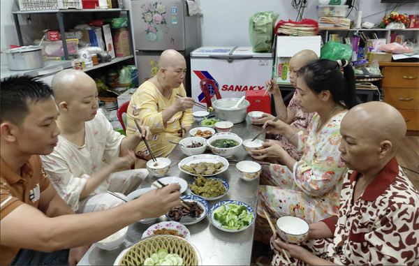 Các bệnh nhân trong “Mái nhà yêu thương” quây quần bên bữa cơm tối sau một ngày điều trị và bươn chải với cuộc sống (Cẩm Nhung ngồi giữa, bên phải ảnh).
