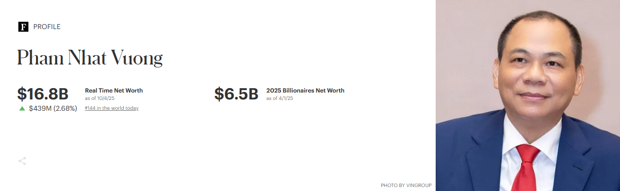 Chủ tịch Vingroup hiện nằm trong nhóm 150 tỷ phú giàu nhất hành tinh. Ảnh: Forbes.